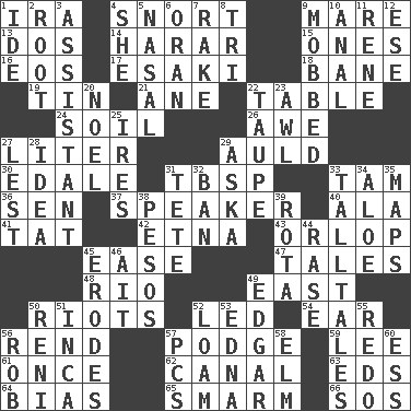 ACROSS 1. Retirement account (abbr.) 4. Derisive sound 9. Female horse 13. Two (Sp.) 14. Ethiopian city, capital of Harari 15. Washington bills 16. Greek goddess of the dawn 17. 1973 Nobel Price Winner (Physics) Leo 18. Object of repulsion 19. Metal container 21. A saturated hydrocarbon 22. Eating place 24. Earth 26. Deep reverence 27. 61 cubic inches 29. Old (Scot.) 30. Peak District village in England 31. Cook's measure (abbr.) 33. Scottish cap 36. Elected rep. 37. Orator 40. In the manner of 41. Make lace 42. Inactive volcano in Sicily 43. Lowest deck of a ship 45. Relaxation 47. Falsehoods 48. River (Sp.) 49. Compass direction 50. Debaucheries 52. Directed 54. Ewer handle 56. Tear apart 57. Puddle 59. Area sheltered from the wind 61. At one time in the past 62. Lessep's creation 63. Begley and Asner 64. Prejudice 65. Excessive but superficial compliments 66. Mayday DOWN 1. Binary compound 2. Carrot, for example 3. Helper 4. A female animal or person 5. Rhinal 6. Northwest Algerian city 7. Libertine 8. Three (prefix) 9. Crowded into 10. Of or related to the anus 11. French philosopher Descartes 12. Compass dir. 20. Christmas carol 22. Grayish beige 23. Leather borer 25. Angers 27. For fear that 28. The main thing one is thinking about 29. "____ silly question..." 31. Wig 32. Prohibit 33. Baron Munchausen's specialties 34. Medicinal plant 35. Atlas contents 38. Mexican monetary units 39. Roll call or roster of names 44. To erase 45. Eats (away) 46. Small island 49. _ Allan Poe 50. Painter Guido (1575-1642) 51. South American Indian 52. Rich soil 53. Pulitzer Prize-winning author Ferber 55. Do over again 56. Director Reiner 57. Personal Computers (abbr.) 58. Shade tree 60. Double-curved letter