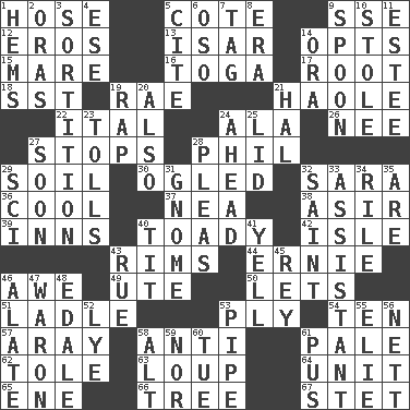 ACROSS 1. Flexible conduit 5. ____ d'Azur (French Riviera) 9. Compass dir. 12. Greek god of love 13. Austrian river, tributary to the Danube 14. Elects 15. Female horse 16. Ancient Roman robe 17. Carrot, for example 18. Fast jet (abbr.) 19. Actress Charlotte 21. White Person, in Hawaii 22. Slanted text style (abbr.) 24. Chicken ___ king 26. Born 27. Halts 28. Silvers or Donahue 29. Land 30. Stared at amorously 32. "Two Mules for Sister ____" 36. Calm and collected 37. Teachers' org. 38. SW Saudi Arabia district 39. Lodging establishments 40. Sycophant 42. Capri or Wright 43. Basketball hoops 44. Bert's buddy 46. Deep reverence 49. Shoshoni 50. Allows 51. Dipping utensil 53. Travel a route regularly 54. Nine, plus one 57. Like ___ of sunshine 58. Opposed to 61. Diluted with white 62. Lacquered or enameled metalware 63. Central Nebraska county 64. A single undivided whole 65. Compass dir. 66. Woody plant 67. Proofreading order DOWN 1. Is hesitant and indecisive 2. Mouths or openings 3. Determination 4. Compass dir. 5. Quote 6. Bear (Spanish) 7. Label 8. Period 9. Soup utensil 10. Fur scarf 11. First name in cosmetics 14. Mouth or opening 19. Hit sharply and swiftly 20. In addition 21. Actor Linden 23. For Whom the Bell _____ 24. At or in the front 25. Flaplike covering 27. Within a short period 28. Entreaties 29. _-fi 31. Dwarf 32. Inhabitant of Heaven 33. Helper 34. Cause heat under the collar 35. "We ___ not amused" (Victoria) 40. Teat (slang) 41. Shout 43. Sorrow 45. Marina Del _, California 46. Having winglike extensions 47. Make _____ (do battle with) 48. Peak District village in England 52. Potassium hydroxide 53. Corncob 55. Writer Wiesel 56. Remaining after all deductions 58. Keyboard modifier key 59. Or not 60. Third day of the wk. 61. Suppuration