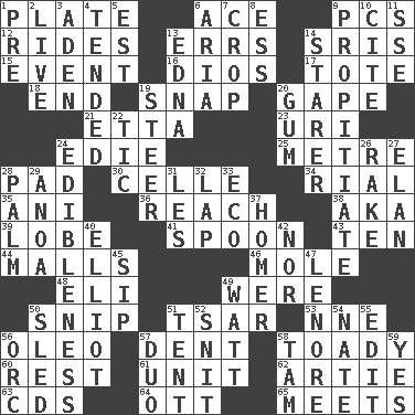 ACROSS 1. Food holder 6. Adept person 9. Personal Computers (abbr.) 12. Amusement-park features 13. Blunders 14. Indian titles of respect 15. Incident 16. "Vaya con ____" 17. Haul 18. Conclude 19. Fastener 20. Stare wonderingly 21. Singer James 23. RI univ. 24. Singer Brickell 25. Distance measurement (Brit.) 28. Writing tablet 30. Cell (Danish) 34. Monetary unit of Yemen 35. Cuckoo 36. Arrive at 38. Alias (abbr.) 39. Ear part 41. Soup utensil 43. "___ Little Indians" 44. Promenades 46. Undercover agent 48. Biblical high priest 49. We are 50. Sever or remove by pinching or nipping 51. Russian ruler of old 53. Compass dir. 56. Butter sub 57. Scratch 58. Sycophant 60. Relief 61. A single undivided whole 62. Nick name for Arthur 63. Music discs 64. Baseball player Mel 65. Confronts DOWN 1. Before (prefix) 2. Moving, as bait 3. An important port of Yemen 4. Looked after 5. Eastern Standard Time (abbr.) 6. Roberta Peters solo 7. Riding implement 8. Double-curved letter 9. Conciliate 10. Quote 11. Compass dir. 13. Pulitzer Prize-winning author Ferber 14. A viewer who gazes fixedly 19. Navigate 20. Chewing product 22. Nervous spasm 24. The property of being fit to eat 26. Libertine 27. Style 28. Inside of hand 29. Small Philippine buffalo 31. French article 32. Infant locale 33. Environmental prefix 37. Homing pigeon 40. American author Paul (1891-1958) 42. Not either 45. Small drink 47. Poe poem 49. Electrical Unit 50. Downhill vehicle 51. Portable shelter 52. In a ____ (agitated or irritated) 54. Nathan's nickname 55. Prepare for publication 56. The grampus (Milton) 57. Superhero pair 58. Scottish cap 59. Affirmative reply