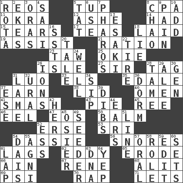 ACROSS 1. Vintage cars 5. Uncastrated adult male sheep 8. Tax preparer (abbr.) 11. Gumbo ingredient 12. American tennis player Robert 14. Possessed 15. Lacerates 17. Beverages made from leaves 18. Put down 19. Help 21. Food allowance for one day 23. The 23rd letter of the Hebrew alphabet 25. Migrant worker of the '30s 26. Capri or Wright 27. Title for a knight 28. Label 31. Nilotic language 33. Raised railways 35. Peak District village in England 37. Merit 38. Flaplike covering 40. Presage 41. Box-office sellout 43. Sliced dessert 45. To separate or throw off 46. Snakelike fish 47. Greek goddess of the dawn 50. Lip ointment 52. Celtic language 53. _ Lanka 54. Small ungulate mammals of Africa 56. Sounds asleep 61. Fails to keep up a pace 62. Whirlpool 65. Eat (away) 66. The 18th letter of the Arabic alphabet 67. French philosopher Descartes 68. Came down and settled, as after flight 69. 23rd letter of the Greek alphabet 70. Strike 71. Allows DOWN 1. Round or rotation of duties 2. Supplements with great effort 3. Mouths or openings 4. Indian skirt 5. Make lace 6. Purpose 7. N Egypt peninsula 8. US Secretary of Labor Elaine L. _ 9. Ache 10. Increase 13. 1973 Nobel Price Winner (Physics) Leo 16. Fast planes 18. Untruth 20. Lie 22. Hoop that covers a wheel 24. Not ill 26. Charged particles 28. Docile 29. Toward shelter 30. Commissioned military rank (abbr.) 31. Unable to walk 32. Mountain range 34. Small drink 36. Dormintory (informal) 37. Compass dir. 39. Claim 42. Possessive pronoun 44. Hearing organs 48. Flexible twig of a willow tree 49. Sowing specialist 51. Actor's bit 52. Double-curved letter 54. Raised platform 55. Hindu god of fire 57. Spoken 58. Hero or heavy, e.g. 59. Prepare for publication 60. Puts into a specified state 61. Infant locale 63. Heredity factor (abbr.) 64. Slangy assent