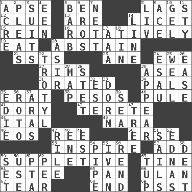 ACROSS 1. Domed church section 5. Benjamin's nick name 8. Straggles 12. A slight indication 13. "We ___ not amused" (Victoria) 14. It is permitted: Lat. 15. It's straight from the horse's mouth 16. Producing rotation 19. Erode 20. Choose not to consume 21. Fast planes 23. A saturated hydrocarbon 24. She-sheep 27. Basketball hoops 30. Toward the sea 31. Declaimed 34. Friends 35. Part of Q.E.F. 38. Mexican monetary units 40. Whine 41. Dinghy 42. Cylindrical with tapered ends 44. Slanted text style (abbr.) 45. Hindu Mythology: god of death 46. Greek goddess of the dawn 47. To separate or throw off 50. Celtic language 53. Heighten or intensify 57. Increase 59. Supplying deficiencies 63. Prong on a fork 64. First name in cosmetics 65. Baking dish 66. Uhlan (variant) 67. Lacerate 68. Conclusion 69. Inconspicuous attention getter DOWN 1. 1/640 square mile 2. Entreaties 3. Sets of matching outer garments 4. Car or cant ending 5. Sharp remark 6. Greek god of love 7. Remaining after all deductions 8. 54 in ancient Rome 9. Adept person 10. Set 11. Filthy place 14. Actor's bit 17. Auto club (abbr.) 18. Metal container 20. SW Saudi Arabia district 22. TNT 24. He sold his birthright 25. Water source 26. Relaxation 28. Atlas unit 29. Proofreading order 30. Seem 32. Compass dir. 33. Dormintory (informal) 35. Singer Brickell 36. Printing process, for short 37. Ancient river in northeast Turkey 39. Ocean 43. Woody plant 47. Cause heat under the collar 48. Compass dir. 49. Eastern Standard Time (abbr.) 51. Travel by water 52. Ferber et al. 54. Corncob 55. "Terrible" tsar 56. Tear apart 58. Scratch 59. Put into a specified state 60. Purpose 61. Parent Teacher Assoc. 62. For each 63. Uncastrated adult male sheep
