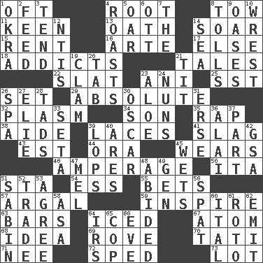 ACROSS 1. Often (poetically) 4. Carrot, for example 8. Pull behind 11. Peachy ____! 13. Pledge 14. Fly high 15. Monthly bill 16. Johnson of "Laugh-In" 17. Otherwise 18. Inveterate users 21. Stories 22. Narrow board 23. Black tropical American cuckoo 25. Fast jet (abbr.) 26. Arrange properly for use 29. Utter; complete 32. Suffix with ecto or cyto 34. Manchild 35. Hit sharply and swiftly 38. Helper 39. Shoestrings 41. Volcanic refuse 43. Eastern Standard Time (abbr.) 44. Mouth or opening 45. Erodes 46. Electrical Measurement 50. Call ___ day 51. R.R. building 54. Double-curved letter 55. Stakes 57. Therefore, facetiously 59. Heighten or intensify 63. Taverns 64. On the rocks 67. Smallest unit of an element 68. The content of cognition 69. Be footloose 70. Jacques of French films 71. Born 72. Hurried 73. Car dealer's back yard DOWN 1. Gumbo ingredient 2. Nourish 3. Look after 4. Ridicules or criticizes harshly 5. Boat paddle 6. Baseball player Mel 7. Definite Article 8. For Whom the Bell _____ 9. Fertile tracts in a desert 10. Take or capture by force 12. Nuclear Threat Initiatives 14. Ocean 19. Burrowing marine mollusk 20. Bar bill 21. Teat (slang) 23. _ vera 24. Religious women 26. Health resort 27. Writer Wiesel 28. Small boys 30. Motion picture award 31. Celtic language 33. Stalk of a moss capsule 36. Jai _ 37. Component 39. Chops off 40. Ancient Greek god of war 42. Girls' org. (abbr.) 45. Soaks 47. Cartoonist voice _ Blanc 48. Remained 49. Commissioned military rank (abbr.) 51. Unit of acoustic absorption 52. Buy and sell 53. Match 56. Argument over a trivial matter 58. White ___ sheet 60. Slanted text style (abbr.) 61. Printing process, for short 62. Send forth 64. Big collection agency 65. Police officer (slang) 66. First lady