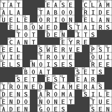 ACROSS 1. Make lace 4. Comfort 8. Burrowing marine mollusk 12. In the manner of 13. Off limits 14. Travel on or in a vehicle 15. Ubangi River tributary 17. Greek mythologigal hunter 18. Flair 19. Shoved, as through a crowd 21. Flight of steps 23. Small child 24. Lair 26. ___ a Wonderful Life 27. Patter 28. Jane of fiction 30. Snakelike fish 31. Turn aside suddenly 34. Pacific Standard Time (abbr.) 37. Compete 38. Collection of objects 39. Fr. "Yes" 40. Raised railways 41. Annoying sounds 42. To riddle 43. Water vessel 44. Puts into a specified state 46. Arrange properly for use 47. Eastern Standard Time (abbr.) 50. Hearing organ 51. Pressed 54. Devices for capturing images 57. Lairs 58. Scent 60. Drop; flow; fall 62. Inside; within (prefix) 63. Music written for nine 64. Third day of the wk. 65. Arabian gulf 66. Moves 67. Elected rep. DOWN 1. The 19th letter of the Greek alphabet 2. Toward shelter 3. Baron Munchausen's specialties 4. Having ears or earlike features 5. Stay 6. "Barney Miller" actor Jack 7. Immeasurably long periods of time 8. Make 9. Ms. Damita and namesakes 10. The sixth month of the Jewish calendar 11. Not women's 13. Pull behind 16. Inky black, to poets 20. Baseball player Mel 22. Become fatigued 25. Effrontery 27. To provide with a ceiling 29. Jacques Cousteau's middle name 30. Night before a holiday 31. Portico 32. Compose 33. Greek goddess of the dawn 34. Likenesses of persons 35. Institutes legal proceedings 36. Standoff 41. Observe 43. Gillaume's butler role 44. Perceive with the eye 45. Hearing organs 46. Something which is sent 48. Biscuitlike quick bread 49. Softens 51. The main thing one is thinking about 52. Tear apart 53. Mild oath, euphamism for damn 55. Floor covering 56. Turn sharply 59. Friend of Pooh 61. Car or cant ending