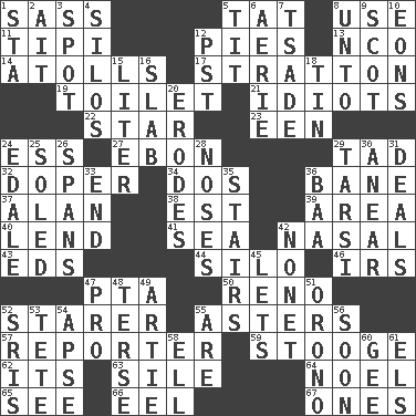 ACROSS 1. Backtalk 5. Make lace 8. Purpose 11. Native american tent (variation) 12. Sliced desserts 13. Non-commissioned officer (abbr.) 14. Ringlike coral islands and reefs 17. Ski resort town in Vermont 19. Bathroom 21. Foolish or stupid persons 22. Play the lead 23. Car or cant ending 24. Curvy letter 27. Inky black, to poets 29. Bit 32. Drug addict 34. Two (Sp.) 36. Object of repulsion 37. Actor Alda or Thicke 38. Eastern Standard Time (abbr.) 39. Type of rug 40. Grant temporary use of 41. Ocean 42. Relating to the nose 43. Begley and Asner 44. Grain storage tower 46. Big collection agency 47. Parent Teacher Assoc. 50. Western Nevada city 52. A viewer who gazes fixedly 55. Michaelmas daisies 57. News announcer 59. Moe Howard, for one 62. ___ a Wonderful Life 63. Filth; sediment 64. Christmas carol 65. Perceive with the eye 66. Snakelike fish 67. Singles DOWN 1. R.R. building 2. Small island 3. Blemish 4. Grain storage towers 5. Teat (slang) 6. Nest on high 7. Sadhe (variant) 8. To (old English) 9. Highlander 10. Immeasurably long periods of time 12. Pacific Standard Time (abbr.) 15. 61 cubic inches 16. Broad, flat, thick piece 18. Metal container 20. Eats (away) 24. Peak District village in England 25. Having a sole or soles 26. Connects, as a bridge 28. Olfactory organs 29. Tarsus (plural) 30. Approach 31. Allots cards 33. Conclusion 35. Flight of steps 36. Sound made by sheep 42. Music written for nine 45. Allows 47. Adept person 48. Laconic 49. Nick name for Arthur 51. U. of Maine site 52. Indian titles of respect 53. False hair 54. Domed church section 55. "We ___ not amused" (Victoria) 56. Within a short period 58. Pipe bend 60. Unit of force equal to gravity 61. Raised railways