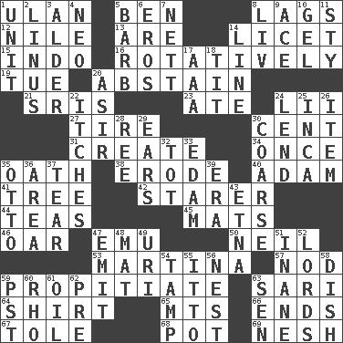 ACROSS 1. ____ Bator, Mongolia 5. Benjamin's nick name 8. Straggles 12. The longest river in the world 13. "We ___ not amused" (Victoria) 14. It is permitted: Lat. 15. Southeast Asian peninsula 16. Rotating or pertaining to rotation 19. Third day of the wk. 20. Refrain by choice 21. Indian titles of respect 23. Had dinner 24. Cards in a Roman deck? 27. Hoop that covers a wheel 30. Penny 31. Cause to be 34. At one time in the past 35. Pledge 38. Wear away 40. First man 41. Relationship diagram 42. A viewer who gazes fixedly 44. Afternoon social gatherings 45. Floor protectors 46. Boat paddle 47. Australian flightless bird 50. Famous astronaut Armstrong 53. Chrissie's court nemesis 57. Lower and raise head in agreement 59. Appease 63. Indian skirt 64. Upper-body garment 65. Mountains (abbr.) 66. Conclusions 67. Lacquered or enameled metalware 68. Plant holder 69. Tender DOWN 1. A single undivided whole 2. "_ and Lucy" (Charlie Brown theme song) 3. Tree or shrub in the Birch family 4. Modern: prefix 5. Sharp remark 6. Greek god of love 7. Remaining after all deductions 8. 54 in ancient Rome 9. Adept person 10. Set 11. Filthy place 14. Actor's bit 17. Auto club (abbr.) 18. Teat (slang) 20. SW Saudi Arabia district 22. Irritating cutaneous sensations 24. Grant temporary use of 25. South American Indian 26. A whole individual unit 28. To separate or throw off 29. Hearing organs 30. Unrefined 32. Small child 33. Dutch treat 35. Von Bismarck 36. Length times width 37. Lacerate 39. Epoch 43. Inactive volcano in Sicily 47. Give off 48. Floor covering 49. RI univ. 51. Lacking in sense or substance 52. Nobles 54. Pack (down) 55. "Tell ____ the Marines!" 56. Egg locale 58. Food container 59. Pacific Standard Time (abbr.) 60. 17th letter of the Greek alphabet 61. Petroleum 62. Before (prefix) 63. Elected rep.