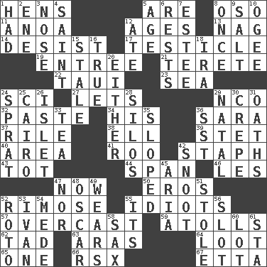 ACROSS 1. Coop moms 5. "We ___ not amused" (Victoria) 8. Bear (Spanish) 11. Small Philippine buffalo 12. Grows older 13. Tired old horse 14. Stop 17. One of the two male reproductive glands 19. Main course 21. Cigar-shaped 22. "Change" in Tahitian 23. Ocean 24. _-fi 27. Allows 29. Non-commissioned officer (abbr.) 32. Thick mixture 34. Part of HMS, perhaps 36. "Two Mules for Sister ____" 37. Cause heat under the collar 38. Pipe bend 39. Proofreading order 40. Type of rug 41. Friend of Pooh 42. Staphylococcus 43. Small child 44. Connect, as a bridge 46. French article 47. At this time 50. Greek god of love 52. Full of chinks, cracks, or crevices 55. Foolish or stupid persons 57. Cloudy 59. Ringlike coral islands and reefs 62. Bit 63. Caspian sea tributary 64. Spoils 65. Single 66. Acura sports coupe 67. Singer James DOWN 1. Possessed 2. Compass dir. 3. Sense of smell 4. Virtuous person 5. Ripen 6. Musical pauses 7. First name in cosmetics 8. At one time in the past 9. Table seasoning 10. Double curve, resembling the letter S 12. Had dinner 15. Showing deterioration from age 16. Loyal 18. Lyricist Gershwin 20. One or the other of two 24. Small fatty European fish 25. Capital of Egypt 26. Small island 28. Grain storage towers 29. Brizilian seaport 30. Streamer paper 31. Expletives 33. Beverage made from leaves 35. Slanted 36. Fast jet (abbr.) 42. Snob 45. Operatic vocal solo 47. Not either 48. Witty Wilde 49. Puts on (as clothing) 51. Took without asking 52. Printing process, for short 53. "Terrible" tsar 54. Ancient Persian 55. ___ a Wonderful Life 56. Groove 58. Saxophone 60. Car dealer's back yard 61. R.R. building