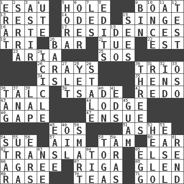ACROSS 1. Son of Isaac 5. Hollow 9. Water vessel 13. Repose 14. Wrote a lyric poem 15. Burn superficially 16. Johnson of "Laugh-In" 17. Homes 19. Three (prefix) 20. Tavern 21. Third day of the wk. 22. Eastern Standard Time (abbr.) 23. Operatic vocal solo 25. Distress signal 26. Trading vessels 30. Musical group of three 34. Small island 35. Coop moms 36. Baby powder 39. Sadhe (variant) 42. Do over again 43. Of or related to the anus 44. Inn 46. Yawn 47. Follow as a consequence or result 48. Greek goddess of the dawn 51. American tennis player Robert 54. Institute legal proceedings 57. Direct toward a target or goal 58. Scottish cap 60. Hearing organ 62. Interpreter 65. Otherwise 66. Match 67. Capital of Latvia 68. Small, secluded valley 69. To erase 70. Afternoon social gatherings 71. Gilt DOWN 1. Part of Q.E.F. 2. Spanish missionary in California 3. Moving or stirring 4. Shoshoni 5. Israeli folk dance 6. River in Europe 7. French article 8. Proofreads 9. Storage container 10. Single time 11. Grows older 12. Trial 15. Perceives with the eye 18. Superhero pair 20. Soap units 24. Ice on the eave 27. The first octave above the treble staff 28. It is so 29. Showing deterioration from age 30. Trios 31. Portuguese money of account (variant) 32. Indiana (abbr.) 33. Bear (Spanish) 36. Label 37. Santa ___, CA 38. Infant locale 40. Spanish title 41. Begley and Asner 45. Island territory of the United States 48. Relaxation 49. Petroleum 50. Don Adams' spy role 52. Phone greeting 53. Artist's stand 54. Play the lead 55. Capital and largest city of Mongolia 56. Hearing organs 58. Ancient Roman robe 59. Ancient river in northeast Turkey 61. Tear apart 63. Born 64. Make a knot 65. Oval reproductive body of a fowl