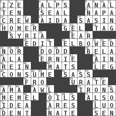 ACROSS 1. Ending with capital 4. High mountains 8. Of or related to the anus 12. Nine, plus one 13. Lick closed 14. California wine valley 15. Group working together 17. Opera by Verdi 18. Indian antelope 19. Baseball hit which scores a run 21. Set 23. Label 24. Damascus' land 26. Hearing organ 28. Prepare for publication 30. Turned at an angle; bent 34. Not either 37. Texas town _ City 39. Actor Lugosi 40. Wing 41. Bert's buddy 43. The 18th letter of the Arabic alphabet 44. It's straight from the horse's mouth 46. Floor coverings 47. Part of a journey 48. Eat 51. Backtalk 54. Away 55. A salt of uric acid 58. Nursemaid (var.) 61. Leather borer 63. Metal shackles 65. Klaipeda city 67. Lubricates 71. In addition 72. The main thing one is thinking about 73. Ancient Greek god of war 74. Nilotic language 75. Scratch 76. Nathan's nickname 77. Elected rep. DOWN 1. Hankering 2. Nothings 3. Foe 4. White ___ sheet 5. Flowery wreath 6. Groovy apt. 7. Volcanic refuse 8. Santa ___, CA 9. Political cartoonist Thomas 10. Capital of Western Samoa 11. Long (Scottish) 16. Past tense of be (plural) 18. Thick slice 20. To free from 22. Snakelike fish 25. Assistant 27. Director Reiner 29. Singer Mel 30. Proofreads 31. Welt 32. Writer Wiesel 33. Mild oath, euphamism for damn 34. Drug cop 35. Butter sub 36. Precipitation 38. Heredity factor (abbr.) 42. He sold his birthright 45. Science/research agcy. 49. Mountain range 50. Cut the grass 52. Indian title of respect (Mr.) 53. "Two Mules for Sister ____" 56. For Whom the Bell _____ 57. Take place subsequently 58. Among 59. Ancient Persian 60. So be it 62. Grant temporary use of 64. Within a short period 66. Erode 68. Retirement account (abbr.) 69. Allow 70. Compass dir.