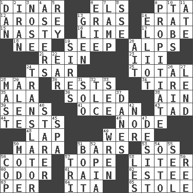 ACROSS 1. Middle Eastern gold or silver currency 6. Raised railways 9. Parent Teacher Assoc. 12. Came up 13. Pate de foie ____ 14. Part of Q.E.F. 15. Thoroughly unpleasant 16. Welles in "The Third Man" 17. Ear part 18. Born 19. Ooze 20. High mountains 21. It's straight from the horse's mouth 23. One more than two 24. Russian ruler of old 25. Add up to 28. Third mo. 30. Musical pauses 34. Hoop that covers a wheel 35. Chicken ___ king 36. Having a sole or soles 38. The 18th letter of the Arabic alphabet 39. Elected reps. 41. Sea 43. Small boy 44. Trials 46. Connecting point 48. Infant locale 49. We are 50. Hindu Mythology: god of death 51. Taverns 53. Mayday 56. ____ d'Azur (French Riviera) 57. Drink excessively 58. 61 cubic inches 60. Aroma 61. Water falling in drops from the sky 62. First name in cosmetics 63. For each 64. Call ___ day 65. Fur scarf DOWN 1. Daniel's nick name 2. SW Asia republic 3. Olfactory organ 4. Michaelmas daisies 5. Marina Del _, California 6. 4th largest of the Great Lakes 7. Desk light 8. Compass dir. 9. Conciliate 10. Bar bills 11. Had dinner 13. Small, secluded valley 14. American author Paul (1891-1958) 19. Founders of families 20. Small island 22. Ewer handle 24. Interpreter 26. Operatic vocal solo 27. Grant temporary use of 28. Vertical spar for supporting sails 29. Toward shelter 31. "Barney Miller" actor Jack 32. Affectionate concern, for short 33. Perceive with the eye 37. Natives or inhabitants of Denmark 40. A viewer who gazes fixedly 42. Or not 45. Health resort 47. Stop 49. Songbird 50. Method 51. Water vessel 52. Capital of Western Samoa 54. "Beetle Bailey" pooch 55. Sew up the eyelids of hawks and falcons 56. Police officer (slang) 57. Three (prefix) 58. French article 59. Portuguese money of account (variant)