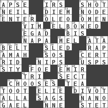 ACROSS 1. Domed church section 5. Big collection agency 8. Opportunity 12. Famous astronaut Armstrong 13. South Vietnam president (1954) 15. Thickened enlargement 16. Keyboard key 18. Margarine 19. Presage 20. Zeal 22. Turned at an angle; bent 24. Mild oath 26. Again 27. California wine valley 28. Cartoonist voice _ Blanc 29. _ moment's notice (2 wds.) 32. Waist strap 35. Downhill vehicle 37. Reproach for some lapse or misdeed 38. Nursemaid 39. Mayday 40. Sure thing 41. To free from 42. Pinches, bites 43. United States Postal Service (abbr.) 44. Filthy place 45. Enemy 46. Independent ruler or chieftain 49. Three (prefix) 50. Religious group 51. Opts 55. Afternoon social gathering 56. A blast of a horn 57. Writer Wiesel 59. A piece of turf (Scot.) 63. Silent film actress Nazimova 64. Droops 65. Billionth: prefix 66. Highlander 67. Compass dir. 68. Proofreading order DOWN 1. A saturated hydrocarbon 2. Animal enclosure 3. Be seated 4. Veterans Day date 5. Wedding promise 6. Cause heat under the collar 7. Stitch closed the eyes of (a falcon) 8. Frozen precipitation (plural) 9. Dwelling 10. Wrote a lyric poem 11. Nine, plus one 14. Crowded into 17. Port city in Latvia 21. Atlas unit 23. Petroleum 25. Small ungulate mammals of Africa 28. Makes clutter 29. Ancient Greek god of war 30. Canvas cover 31. Flats, for short 32. Drinking establishments 33. Send forth 34. Kenny Rogers chart-topper in '80 36. Trim (branches) 40. Window treatments 42. Annoying sounds 45. Away 47. Was introduced to 48. On the rocks 49. "_____ Recall" 51. Root beer relative 52. Hollow 53. Flair 54. Public display of a written message 56. Label 58. Compass dir. 60. Large container 61. Single 62. Small child