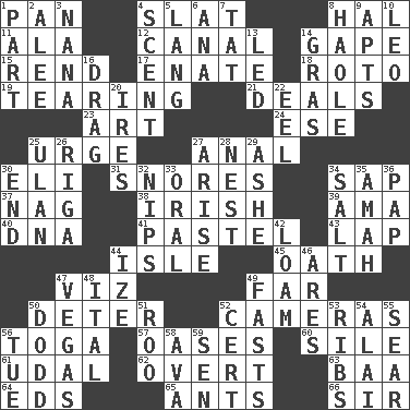 ACROSS 1. Baking dish 4. Narrow board 8. Actor Linden 11. According to 12. Lessep's creation 14. Stare wonderingly 15. Tear apart 17. Related on the mother's side 18. Printing process, for short 19. Pulling apart 21. Allots cards 23. Nonscientific branch of learning 24. Compass dir. 25. Goad 27. Of or related to the anus 30. Connecticut Ivy Leaguer 31. Sounds asleep 34. Plant excrement 37. Tired old horse 38. From or relating to Ireland 39. Housemaid (var.) 40. Heredity factor (abbr.) 41. Soft color 43. Pet locale 44. Capri or Wright 45. Pledge 47. To wit 49. At a great distance 50. Prevent from occurring 52. Devices for capturing images 56. Ancient Roman robe 57. Fertile tracts in a desert 60. Filth; sediment 61. Hereditary estate 62. Unconcealed 63. Sound made by sheep 64. Begley and Asner 65. Pismires 66. Title for a knight DOWN 1. Component 2. Toward shelter 3. Grandmother 4. Odor 5. Austrian-born American filmmaker Fritz 6. Santa ___, CA 7. Make lace 8. White Person, in Hawaii 9. Tenement units (abbr.) 10. Lion 13. Directed 14. Pate de foie ____ 16. To draw with force 20. Angers 22. Snakelike fish 25. ____ Bator, Mongolia 26. Capital of Latvia 27. Ascend 28. Egg locale 29. American tennis player Robert 30. Conclusion 32. Cuts off 33. Relating to the mouth 34. Table seasoning 35. Nursemaid 36. Infant food 42. Rich soil 44. Ending with capital 46. Ancient Greek god of war 47. Viva Las _ 48. Slanted text style (abbr.) 49. Goes without food and/or water 50. Texas town _ City 51. Friend of Pooh 52. An absolute certainty 53. Chest bones 54. Mountain range southwest of Kyrgyzstan 55. Burn superficially 56. Third day of the wk. 58. Actress Gardner 59. Elected rep.