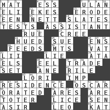 ACROSS 1. Floor protector 4. Double-curved letter 7. ____ Bator 11. Biblical high priest 12. Supplements with great effort 13. Eat (away) 14. Car or cant ending 15. Remaining after all deductions 16. Chalkboards 17. Trials 19. Aide 21. Sorrow 23. Algonquian 24. Became colored 25. Institute legal proceedings 26. Followers of ems 29. Eats 30. Mountains (abbr.) 31. Large container 32. Cards in a Roman deck? 33. Untruth 34. "One Day ___ Time" 35. Raised railways 36. Snakelike fish 37. Barter 40. Put into a specified state 41. A saturated hydrocarbon 42. Cause heat under the collar 43. Australian parrot (variant) 45. Naughty child 46. Home 51. Motion picture award 55. Declaimed 56. Ancient Greek god of war 58. "We ___ not amused" (Victoria) 59. Carrier 60. Louse (plural) 61. Elected rep. 62. SW Saudi Arabia district 63. Lion 64. Krazy ___ of comics DOWN 1. Rendezvous 2. Toward shelter 3. Canisters 4. Make supply last 5. Bristle 6. Fast planes 7. A salt of uric acid 8. Globular water bottle used in Asia 9. Arabian gulf 10. A home for chicks 12. Took place subsequently 13. Otherwise 16. Fathers 18. Loyal 20. Turtle shell scale 22. Begley and Asner 24. Robbery 25. Grin 26. Elude 27. Nathan's nickname 28. R.R. building 29. Do some clerical work 32. French article 33. Soviet premier 1918-24 36. Having ears or earlike features 37. Three (prefix) 38. Full of chinks, cracks, or crevices 39. High mountains 43. 61 cubic inches 44. River in Europe 46. Round or rotation of duties 47. Greek god of love 48. Suttee (variant) 49. Give a ring to 50. One of the Great Lakes 52. Keg 53. Type of rug 54. Monthly bill 57. Environmental prefix