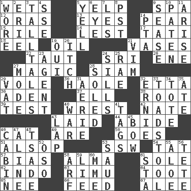ACROSS 1. Moistens 5. Sharp bark 9. Health resort 12. Mouths or openings 13. Sight organs 14. Lightbulb-shaped fruit 15. Cause heat under the collar 16. For fear that 17. Jacques of French films 18. Snakelike fish 19. Petroleum 21. Flower holders 22. Pulled tight 24. _ Lanka 26. Compass dir. 27. Mysterious quality of enchantment 28. Thailand, formerly 29. Grand slam 30. White Person, in Hawaii 32. Singer James 36. An important port of Yemen 37. Pipe bend 38. Carrot, for example 39. Trial 40. Take or capture by force 42. Nathan's nickname 43. Put down 44. Tolerate 46. Feline 49. "We ___ not amused" (Victoria) 50. Leaves 51. Columnist Joseph or Stewart 53. Compass dir. 54. Make lace 57. Prejudice 58. _ mater 61. Flatfish 62. Southeast Asian peninsula 63. Tall New Zealand timber tree 64. A blast of a horn 65. Born 66. Nourish 67. Toward shelter DOWN 1. Had on 2. One of the Great Lakes 3. Baron Munchausen's specialties 4. Compass dir. 5. Shout 6. Sight organ 7. French article 8. Pacific Standard Time (abbr.) 9. Gospel singer Marvin 10. Eucharist need 11. Ascend 14. Parent Teacher Assoc. 19. Fr. "Yes" 20. Hankering 21. Zeal 23. Rep 24. Beverly of Met fame 25. Actress Charlotte 27. Method 28. Having a sole or soles 29. Large container 31. Nest on high 32. Bert's buddy 33. Inedible or poisonous agaric 34. Carryall 35. Had dinner 40. Armed conflict 41. Labels 43. Pet locale 45. Arrow shooter 46. Apartment or room in a ship 47. Place in a line 48. Sadhe (variant) 52. Bear (Spanish) 53. Saudi Arabian king (1953-1964) 55. Medicinal plant 56. False hair 58. Sandy's bark 59. Whopper 60. Madame (abbr.) 61. R.R. building