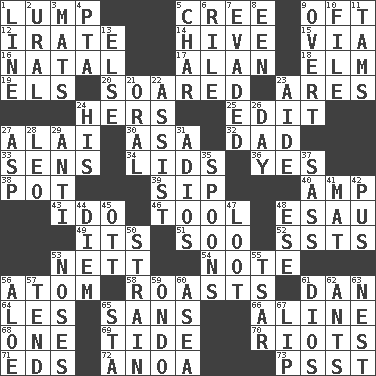 ACROSS 1. Mass 5. Algonquian 9. Often (poetically) 12. Feeling or showing extreme anger 14. Hub of activity 15. By way of 16. Brizilian seaport 17. Actor Alda or Thicke 18. Shade tree 19. Raised railways 20. Flew 23. Ancient Greek god of war 24. Possessive pronoun 25. Prepare for publication 27. Jai ____ 30. White ___ sheet 32. June honoree 33. Elected reps. 34. Flaplike coverings 36. Affirmative reply 38. Plant holder 39. Small drink 40. Electrical Unit 43. Wedding promise 46. Instrument 48. Son of Isaac 49. It is 51. "Barney Miller" actor Jack 52. Fast planes 53. Remaining after all deductions 54. Short letter 56. Smallest unit of an element 58. Exposes to great heat 61. Daniel's nick name 64. French article 65. Without 66. Place in a line 68. Single 69. Event that recurs at intervals 70. Disturbances 71. Begley and Asner 72. Small Philippine buffalo 73. Inconspicuous attention getter DOWN 1. Actor's bit 2. Mountain range 3. Floor coverings 4. Parent Teacher Assoc. 5. Burn to charcoal 6. Cause heat under the collar 7. Dodged 8. Car or cant ending 9. Unconcealed 10. Do some clerical work 11. Scottish caps 13. Otherwise 21. Taken by mouth 22. Aid 23. Helper 24. Part of HMS, perhaps 26. 24 hours 27. Viper 28. Lion 29. Opposed to 31. Goodbye (Sp.) 35. Soup utensils 37. Backtalk 41. Floor protector 42. Suppuration 44. South Vietnam president (1954) 45. Baseball player Mel 47. Spoils 48. Compass dir. 50. Put through a sieve 53. Olfactory organs 55. Russian ruler of old 56. _ vera 57. Watch over 59. Southwest Nigerian state 60. At sea 61. "Vaya con ____" 62. Pismires 63. Egg locale 65. R.R. building 67. Mouth edge