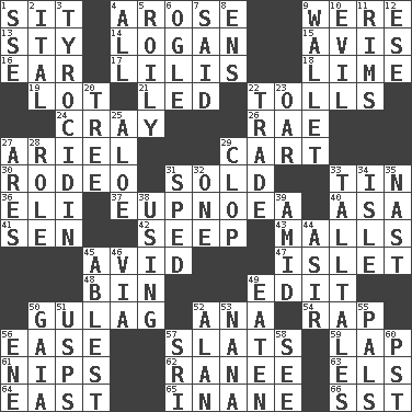 ACROSS 1. Be seated 4. Came up 9. Past tense of be (plural) 13. Filthy place 14. Utah city north of Ogden 15. Deliberation 16. Ewer handle 17. Ms. Damita and namesakes 18. Welles in "The Third Man" 19. Car dealer's back yard 21. Directed 22. For Whom the Bell _____ 24. Supercomputer manufacturer 26. Actress Charlotte 27. Satellite of Uranus 29. Heavy open wagon 30. Cowboy competition 31. Exchanged or delivered for money 33. Shallow baking pan 36. Biblical high priest 37. Normal relaxed breathing 40. White ___ sheet 41. Elected rep. 42. Ooze 43. Promenades 45. Enthusiastic 47. Small island 48. Storage container 49. Prepare for publication 50. POW camp 52. Santa ___, CA 54. Hit sharply and swiftly 56. Relaxation 57. Narrow boards 59. Infant locale 61. Pinches, bites 62. The wife of a rajah (variant) 63. Raised railways 64. Compass direction 65. Silly 66. Fast jet (abbr.) DOWN 1. Compass dir. 2. Slanted text style (abbr.) 3. Polypeptide antibiotic 4. 100% 5. Turbulent 6. Stare at amorously 7. Stated 8. Followers of ems 9. Place for singles 10. Morally bad or wrong 11. Basketball hoops 12. Compass dir. 20. Relationship diagram 22. Buy and sell 23. Boat paddle 25. Medicinal plant 27. Ancient Greek god of war 28. Hero or heavy, e.g. 29. Hoof sound 31. Hurried 32. Single 33. Baron Munchausen's specialties 34. Small island 35. Political cartoonist Thomas 38. Exploiting 39. Among 44. SW Saudi Arabia district 45. Most capable 46. By way of 49. Ingested 50. Greek goddess of the earth (variant) 51. United States Postal Service (abbr.) 52. ____ Jay Lerner 53. Grandmother 55. Friends 56. Compass dir. 57. Indian title of respect (Mr.) 58. Observe 60. Pacific Standard Time (abbr.)