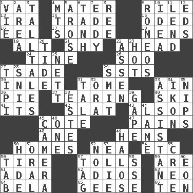 ACROSS 1. Large container 4. Mother 9. Cause heat under the collar 13. Retirement account (abbr.) 14. Exchange 15. Wrote a lyric poem 16. Snakelike fish 17. Message 18. Not women's 19. Keyboard modifier key 21. Like a shrinking violet 22. Toward the future 24. Prong on a fork 26. "Barney Miller" actor Jack 27. Sadhe (variant) 29. Fast planes 30. An arm off of a larger body of water 31. Heavy book 33. The 18th letter of the Arabic alphabet 36. Sliced dessert 37. Pulling into pieces 40. What Jean-Claude Killy likes to do 41. It is 42. Narrow board 43. Columnist Joseph or Stewart 45. ____ d'Azur (French Riviera) 47. Aches 48. One (Scot) 49. Equivocates 50. Residences 52. Teachers' org. 54. And so on (abbr.) 56. Hoop that covers a wheel 57. For Whom the Bell _____ 59. "We ___ not amused" (Victoria) 61. The sixth month of the Jewish calendar 62. Goodbye (Sp.) 63. Modern: prefix 64. Actor Lugosi 65. Honkers 66. "___ Little Indians" DOWN 1. Compete 2. Length times width 3. Baron Munchausen's specialties 4. Mountains (abbr.) 5. Came up 6. Hyperbolic tangent 7. Whirlpool 8. Portuguese money of account (variant) 9. Lover boys 10. The content of cognition 11. Grant temporary use of 12. Begley and Asner 20. Event that recurs at intervals 22. NE Netherlands city 23. Being at a high temperature 25. Remaining after all deductions 27. Native american tent (variation) 28. In a ____ (agitated or irritated) 29. Stricken, poetically 31. Lie 32. Mouth or opening 33. Helper 34. Visual representation of an object 35. Pinches, bites 38. _____ Park, CO 39. Yawn 44. Unable to walk 45. Device for capturing images 46. Single 49. Rings 50. Flintstone garb 51. Spoken 52. Connecting point 53. Writer Wiesel 55. Algonquian 56. Bar bill 57. Label 58. Compass dir. 60. Period of immesurable duration
