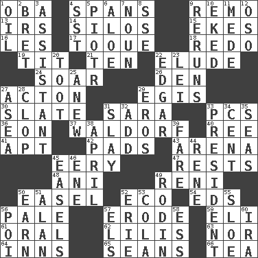 ACROSS 1. Chief or king in Benin or Nigeria 4. Connects, as a bridge 9. San ____ (Riviera town) 13. Big collection agency 14. Grain storage towers 15. Supplements with great effort 16. French article 17. Woman's close-fitting hat 18. Do over again 19. Teat (slang) 21. Nine, plus one 22. Dodge 24. Fly high 26. Lair 27. NE Massachussets city 29. Armor plate that protects the chest 30. Schedule 31. "Two Mules for Sister ____" 33. Personal Computers (abbr.) 36. Period of immesurable duration 37. Apple salad 40. To riddle 41. Fitting 42. Writing tablets 43. Sports stadium 45. Suggestive of the supernatural 47. Musical pauses 48. Black tropical American cuckoo 49. Painter Guido (1575-1642) 50. Artist's stand 52. Environmental prefix 54. Begley and Asner 56. Diluted with white 57. Eat (away) 59. Biblical high priest 61. Spoken 62. Ms. Damita and namesakes 63. And not 64. Taverns 65. Actors Connery and Penn 66. Beverage made from leaves DOWN 1. Lubricate 2. Cy Young winner Saberhagen 3. Aide 4. Fast jet (abbr.) 5. Peter (Polish) 6. _ vera 7. Part of speech 8. Compass dir. 9. Summer TV shows 10. Supplemented with great effort 11. Ancient Persian 12. Bear (Spanish) 20. A blast of a horn 22. _ Allan Poe 23. Flowery wreath 25. Afresh 27. At sea 28. Hoof sound 29. Greek god of love 31. Kill 32. Find the sum of 33. Elected leader of a country 34. Penny 35. Oceans 38. Showery time 39. Conductor's collection 44. French philosopher Descartes 45. Artist's stands 46. Compass dir. 49. "The Thinker" sculptor 50. Merit 51. Actor Alda or Thicke 52. One of the Great Lakes 53. Root beer relative 55. A type of plum 56. Luau course 57. Raised railways 58. Curvy letter 60. Lyricist Gershwin