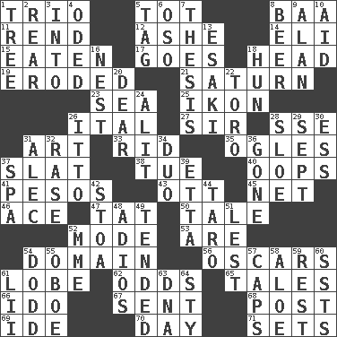 ACROSS 1. Musical group of three 5. Small child 8. Sound made by sheep 11. Tear apart 12. American tennis player Robert 14. Connecticut Ivy Leaguer 15. Ingested 17. Travels 18. Froth on beer 19. Worn away 21. Titan orbits this 23. Ocean 25. Visual representation of an object 26. Slanted text style (abbr.) 27. Title for a knight 28. Compass dir. 31. Nonscientific branch of learning 33. To free from 35. Stares 37. Narrow board 38. Third day of the wk. 40. I made a mistake 41. Mexican monetary units 43. Baseball player Mel 45. Fish or hair follower 46. Adept person 47. Make lace 50. Story 52. Method 53. "We ___ not amused" (Victoria) 54. Kingdom 56. Motion picture awards 61. Ear part 62. Probability 65. Falsehoods 66. Wedding promise 67. Emitted 68. Mail 69. Binary compound 70. 24 hours 71. Arranges properly for use DOWN 1. Woody plant 2. Hitchcock's "____ Window" 3. To the inside or interior of 4. Wrote a lyric poem 5. Label 6. Bear (Spanish) 7. College paper 8. Fermented drink made from hops 9. Actor Alda or Thicke 10. Assist 13. 1973 Nobel Price Winner (Physics) Leo 16. Egg locale 18. Attila the _ 20. Letter starter 22. "Corrida" creature 24. Came down and settled, as after flight 26. "Tell ____ the Marines!" 28. A type of plum 29. Back-to-school mo. 30. Double-curved letter 31. Actor Baldwin 32. To erase 34. Superhero pair 36. Went 37. Health resort 39. Singer James 42. Portico 44. Edible starchy tuberous root 48. Goodbye (Sp.) 49. Watched over 51. For fear that 52. Madame (abbr.) 54. Texas town _ City 55. Mitch Miller's instrument 57. Balmoral and tarboosh 58. _ vera 59. Take ten 60. Fast planes 61. Cards in a Roman deck? 63. Heredity factor (abbr.) 64. Filthy place
