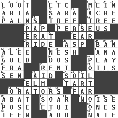 ACROSS 1. Spoils 5. And so on (abbr.) 8. Chow _ 12. Roberta Peters solo 13. "Two Mules for Sister ____" 15. 1/640 square mile 16. Insides of hands 18. Not kosher 19. Family _ (genealogy) 20. Infant food 22. Son of Zeus who helped slay Medusa 24. Part of Q.E.F. 26. Ewer handle 27. Travel on or in a vehicle 28. Cleo's killer 29. Prohibit 32. Toward shelter 35. Soft 37. Santa ___, CA 38. Aureate 39. Two (Sp.) 40. Live dramatic performance 41. Epoch 42. Painter Guido (1575-1642) 43. Lubricates 44. Elected rep. 45. Assist 46. The visible part of the earth's surface 49. Shade tree 50. Small pie 51. Speakers 55. At a great distance 56. Blind as ____ 57. Fly high 59. Annoying sound 63. Airs 64. Needle holder 65. Washington bills 66. Adolescent 67. Increase 68. Nathan's nickname DOWN 1. Infant locale 2. Mouth or opening 3. Lubricate 4. ________ with (broke a safety seal) 5. Eastern Standard Time (abbr.) 6. Canvas cover 7. Algonquian 8. Mother 9. Shade of tan 10. Angers 11. Born 14. Anew 17. Indian skirt 21. Groovy apt. 23. Plant excrement 25. Looked after 28. Help 29. Indonesian resort city 30. Of or related to the anus 31. Negative votes 32. Grows older 33. Old wives' tales, e.g. 34. Style 36. Period of immesurable duration 40. Characterized by complete cowardliness 42. Full of chinks, cracks, or crevices 45. The first octave above the treble staff 47. Clumsy lout 48. SW Asia republic 49. Eroded 51. Mitch Miller's instrument 52. To erase 53. Round or rotation of duties 54. Saudi Arabian king (1953-1964) 56. Fitting 58. To free from 60. _ tizzy (2 wds.) 61. Put into a specified state 62. Compass dir.