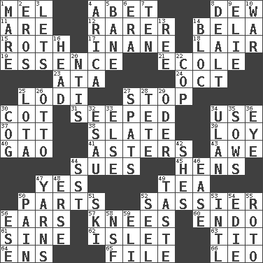 ACROSS 1. Cartoonist voice _ Blanc 4. Collude with 8. Morning condensation 11. "We ___ not amused" (Victoria) 12. More uncommon 14. Actor Lugosi 15. Writer of Portnoy's Complaint (1969) 17. Lacking in sense or substance 18. Den 19. Substance 21. Learning spot: Fr. 23. "One Day ___ Time" 24. Sep. follower 25. Farming town in central California 27. Close up, plug up 30. Small bed 31. Oozed 34. Purpose 37. Baseball player Mel 38. Schedule 39. Myrna of the movies 40. E Mali city 41. Michaelmas daisies 43. Deep reverence 44. Takes to court 45. Coop moms 47. It is so 49. Beverage made from leaves 50. Components 52. More impudent 56. Hearing organs 57. Leg joints 60. Inside; within (prefix) 61. Trig term 62. Small island 63. Teat (slang) 64. Followers of ems 65. Do some clerical work 66. Lion DOWN 1. Female horse 2. Greek god of love 3. Allows 4. N. Chile seaport 5. Object of repulsion 6. Period 7. Nine, plus one 8. Started a card game 9. Writer Wiesel 10. Armed conflict 13. Portuguese money of account (variant) 14. Alliance 16. Froth on beer 20. Nuclear Threat Initiatives 22. Police officer (slang) 25. Globular water bottle used in Asia 26. Von Bismarck 27. Arguments over trivial matters 28. Wig 29. Baltic tributary 30. Gear tooth 32. Son of Isaac 33. Otherwise 34. ____ Bator 35. Sty mamas 36. Sight organ 42. "______ My Girl" (Turtles hit) 44. Fast jet (abbr.) 46. Comfort 47. Entertaining tales 48. Celtic language 49. Clothes sense 50. Ache 51. What Jean-Claude Killy likes to do 52. Stitch closed the eyes of (a falcon) 53. International (abbr.) 54. Singer Brickell 55. Printing process, for short 56. Compass dir. 58. Science/research agcy. 59. Connecticut Ivy Leaguer
