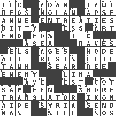 ACROSS 1. Affectionate concern, for short 4. First of billions? 8. Pulled tight 12. Vintage cars 14. Pitcher Ryan 16. Domed church section 17. Queen of England 1702-14 18. Pleas 20. Simple song 22. Double-curved letter 23. Tate display 24. Conclusion 25. Begley and Asner 28. Nervous spasm 30. At sea 31. All-night dance parties 35. Raised railways 37. Matures 40. Method 41. Came down and settled, as after flight 42. Musical pauses 44. Writer Wiesel 45. Hyperbolic tangent 46. Dry up 47. To separate or throw off 48. Foe 50. Pale green bean 52. "___ Maria" 54. Eastern Standard Time (abbr.) 55. Small bed 58. Plant excrement 61. Car or cant ending 63. Dinah or Pauly 65. Interpreter 70. Image 71. Helper 72. Damascus' land 73. Post 74. Political cartoonist Thomas 75. Filth; sediment 76. Mayday DOWN 1. Exchange 2. Soviet premier 1918-24 3. Continued (abbr.) 4. A saturated hydrocarbon 5. Spanish title 6. Keyboard modifier key 7. Female horse 8. Make lace 9. Capital of Western Samoa 10. One who uses or employs something 11. Trial 13. Arrange properly for use 15. A home for chicks 19. SW Saudi Arabia district 21. Affirmative reply 26. Letter starter 27. Gurus 29. Device for capturing images 30. Respiratory problem 32. Grand slam 33. Singer Brickell 34. Perceive with the eye 35. Style 36. Actor's bit 38. Compass dir. 39. Having lost freshness 41. Had dinner 43. Indian titles of respect 49. Jacques Cousteau's middle name 51. Mountains (abbr.) 53. Snakelike fish 55. Popular sodas 56. U. of Maine site 57. Watches over 58. Comedian Laurel of Laurel & Hardy 59. Roberta Peters solo 60. Groovy apts. 62. Negative votes 64. Part of HMS, perhaps 66. Fish or hair follower 67. Three (prefix) 68. Petroleum 69. Actress Charlotte