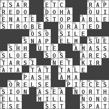 ACROSS 1. Austrian river, tributary to the Danube 5. And so on (abbr.) 8. Reproach for some lapse or misdeed 11. Do over again 12. Capital of the state of Qatar 14. Fr. "Yes" 15. Maternal 17. Halt 18. Competent 19. Disco prop 21. Declaimed 23. Bear (Spanish) 25. Filth; sediment 26. Fastener 27. Shade tree 28. Take to court 31. Quiet! 33. Shoshoni 35. Collect or gather 37. A type of plum 38. Distress signal 40. Ancient Greek god of war 41. Tarsus (plural) 43. Fish or hair follower 45. Apertif with cassis 46. "One Day ___ Time" 47. Make lace 50. Falsehood 52. Romantic infatuation 53. Nursemaid (var.) 54. Threatening words 56. Components 61. The Jewish people; Israel 62. At sea 65. _ pole 66. Pipe bend 67. Place where flour is made 68. Words to Nanette 69. Compass dir. 70. Fast jet (abbr.) 71. Petty quarrel DOWN 1. Angers 2. Posted 3. The sixth month of the Jewish calendar 4. Printing process, for short 5. Begley and Asner 6. Small child 7. Elect 8. Loose flowing garment 9. Old (Scot.) 10. Sliced dessert 13. Showery time 16. Inky black, to poets 18. Had dinner 20. Son of Isaac 22. _ mater 24. Elects 26. "______ My Girl" (Turtles hit) 28. Indian skirt 29. One who uses or employs something 30. Curvy letter 31. Narrow board 32. Israeli folk dance 34. Age 36. Cause to be 37. R.R. building 39. Stalk of a moss capsule 42. Slanted text style (abbr.) 44. Pack (down) 48. Indian state 49. College paper 51. (Had) reclined 52. Fenced enclosure 54. Lubricates 55. Hero or heavy, e.g. 57. Immeasurably long periods of time 58. Riding implement 59. Inactive volcano in Sicily 60. Opportunity 61. Perceive with the eye 63. Raised railways 64. The first octave above the treble staff