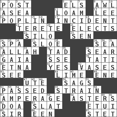 ACROSS 1. Mail 5. Raised railways 8. Leather borer 11. At sea 12. Rich soil 13. Area sheltered from the wind 14. Cotton for raincoats, e.g. 17. Event 19. Cigar-shaped 21. Chooses 22. Grain storage tower 23. Elected rep. 24. Health resort 27. A type of plum 29. Ocean 32. Assad's deity 34. Small amount or degree 36. Dry up 37. Greek goddess of the earth (variant) 38. Compass dir. 39. Jacques of French films 40. Inactive volcano in Sicily 41. Affirmative reply 42. Flower holders 43. Observe 44. Welles in "The Third Man" 46. Compass dir. 47. Shoshoni 50. Droops 52. Went by 55. Put through a sieve 57. Electrical Measurement 59. Michaelmas daisies 62. ___ good deed 63. Narrow board 64. Needle case 65. Title for a knight 66. Car or cant ending 67. Proofreading order DOWN 1. Infant food 2. Bear (Spanish) 3. Back-to-school mo. 4. Falsehoods 5. Period of immesurable duration 6. Shoestrings 7. Grin 8. Actor Baldwin 9. Left 10. Allows 12. Untruth 15. From or relating to Ireland 16. 1994 drama film starring Jodie Foster 18. Lair 20. A girl or young woman (variant) 24. Gurus 25. Food holder 26. Place in a line 28. Artist's stand 29. Gospel singer Marvin 30. Ingested 31. Originate 33. Auto club (abbr.) 35. Stop 36. R.R. building 42. Viva Las _ 45. Hindu Mythology: god of death 47. Purpose 48. Laconic 49. Peak District village in England 51. Locates 52. Groovy apts. 53. Mine, in Marseilles 54. Practice fight 55. Arrange properly for use 56. Remaining after all deductions 58. Separate the seeds from cotton 60. Regret 61. Be seated