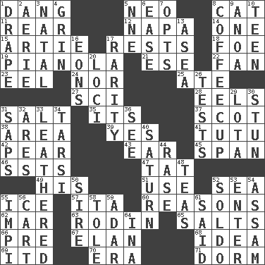 ACROSS 1. Mild oath, euphamism for damn 5. Modern: prefix 8. Feline 11. Posterior 12. California wine valley 14. Single 15. Nick name for Arthur 17. Musical pauses 18. Enemy 19. Player piano 21. Compass dir. 22. Air blower 23. Snakelike fish 24. Not either 25. Had dinner 27. _-fi 28. Snakelike fish 31. Table seasoning 35. ___ a Wonderful Life 37. Highlander 38. Length times width 39. Consenting reply 41. Ballerina skirt 42. Lightbulb-shaped fruit 43. Ewer handle 45. Connect, as a bridge 46. Fast planes 47. Make lace 49. Part of HMS, perhaps 51. Purpose 52. Ocean 55. Frozen water 57. Call ___ day 60. Thinks logically 62. Make imperfect 63. "The Thinker" sculptor 65. Table seasonings 66. Before (prefix) 67. Flair 68. The main thing one is thinking about 69. It would 70. Epoch 71. Dormintory (informal) DOWN 1. Window treatment 2. Nest on high 3. Relating to or accompanying birth 4. Smile widely 5. Compass dir. 6. Relaxation 7. Chooses 8. Java holder (2 wds.) 9. Small Philippine buffalo 10. Adolescent 13. At sea 16. Immeasurably long periods of time 17. Noteworthy scarcity 20. Venues 26. Trials 29. Globular water bottle used in Asia 30. Make senseless or dizzy 31. Plant excrements 32. Ancient Greek god of war 33. Resembling or made to resemble leather 34. Tarsus (plural) 36. Observe 40. Titan orbits this 44. Raze (variant) 48. Beverages made from leaves 50. Father 52. Twentieth part of a lira 53. Keyboard key 54. Indian state 55. Body of Kaffir warriors 56. Draw slowly or heavily 58. Lacquered or enameled metalware 59. The sixth month of the Jewish calendar 61. Expressed in words 64. _ tizzy (2 wds.)
