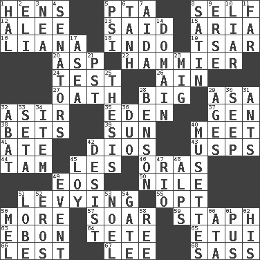 ACROSS 1. Coop moms 5. Parent Teacher Assoc. 8. Itself 12. Toward shelter 13. Stated 15. Roberta Peters solo 16. Woody, climbing, usually tropical plant 18. _ china 19. Russian ruler of old 20. Cleo's killer 22. More given to overacting 24. Trial 26. The 18th letter of the Arabic alphabet 27. Pledge 28. Large 29. White ___ sheet 32. SW Saudi Arabia district 35. Locale of original sin 37. Commissioned military rank (abbr.) 38. Stakes 39. Player for Phoenix 40. Confront 41. Had dinner 42. "Vaya con ____" 43. United States Postal Service (abbr.) 44. Scottish cap 45. French article 46. Mouths or openings 49. Greek goddess of the dawn 50. The longest river in the world 51. Imposing or collecting, as a tax 55. Elect 56. Greater amount 57. Fly high 59. Staphylococcus 63. Inky black, to poets 64. False hair 65. Needle case 66. For fear that 67. Area sheltered from the wind 68. Backtalk DOWN 1. Actor Linden 2. Connecticut Ivy Leaguer 3. Teachers' org. 4. Legislators 5. 23rd letter of the Greek alphabet 6. Hyperbolic tangent 7. Opera by Verdi 8. Smooth fabric 9. Celtic language 10. One who doesn't tell the truth 11. At a great distance 14. Realm 17. At sea 21. Pacific Standard Time (abbr.) 23. Russian fighter aircraft 25. College paper 28. Gillaume's butler role 29. Matures 30. Ooze 31. Pismires 32. Blind as ____ 33. Bristle 34. Detail 36. Superhero pair 40. French bagpipes 42. Stop 45. Myrna of the movies 47. River (Sp.) 48. High mountains 49. Happening 51. Ear part 52. Greek god of love 53. Christmas carol 54. Yard entry 56. Cartoonist voice _ Blanc 58. To sift 60. "One Day ___ Time" 61. Tenth month of the Hindu calendar 62. Part of HMS, perhaps