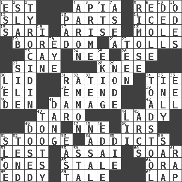 ACROSS 1. Eastern Standard Time (abbr.) 4. Capital of Western Samoa 8. Make new 12. Roguish 13. Actors' quests 14. On the rocks 15. Indian skirt 17. Originate 18. Undercover agent 19. Mood resulting from idleness 21. Ringlike coral islands and reefs 23. Island 24. Born 26. Compass dir. 27. Trig term 28. Leg joint 30. Hat (slang) 31. Food allowance for one day 34. Make a knot 37. Biblical high priest 38. Make improvements or corrections to 39. Single 40. Lair 41. Break 42. Everything 43. Edible starchy tuberous root 44. Kenny Rogers chart-topper in '80 46. Spanish title 47. Compass dir. 50. Big collection agency 51. Moe Howard, for one 54. Inveterate users 57. For fear that 58. Slender Brazilian palm 60. Fly high 62. Washington bills 63. Having lost freshness 64. Mouth or opening 65. Whirlpool 66. Falsehood 67. Infant locale DOWN 1. Double-curved letter 2. Thick slice 3. Polypeptide antibiotic 4. Composer Copland 5. First class 6. ___ a Wonderful Life 7. At sea 8. Full of chinks, cracks, or crevices 9. Learning spot: Fr. 10. Small valley 11. Lyric poems 13. Groovy apt. 16. SW Asia republic 20. Sight organ 22. Adolescent 25. Supplementing with great effort 27. Drop; flow; fall 29. Thickened enlargement 30. Directed 31. Rump 32. ID or VA city 33. Afternoon social gathering 34. Inedible or poisonous agaric 35. In an inward manner 36. Snakelike fish 41. Mild oath, euphamism for damn 43. A girl or young woman (variant) 44. Cards in a Roman deck? 45. Arches 46. Administered medicine 48. Relating to the nose 49. Peak District village in England 51. A type of plum 52. Watch over 53. 90 degrees 55. Pass on 56. "Two Mules for Sister ____" 59. R.R. building 61. Hit sharply and swiftly