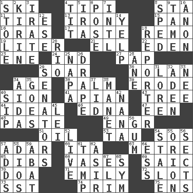 ACROSS 1. What Jean-Claude Killy likes to do 4. Native american tent (variation) 8. R.R. building 11. Become fatigued 13. Literary sarcasm 15. Baking dish 16. Mouths or openings 17. Clothes sense 18. San ____ (Riviera town) 19. 61 cubic inches 21. Pipe bend 22. Locale of original sin 23. Compass dir. 24. Indiana (abbr.) 27. Infant food 29. Fly high 30. Pitcher Ryan 34. Ripen 36. Inside of hand 39. Wear away 40. The Jewish people; Israel 41. Bee-related 43. Family _ (genealogy) 44. Perfect 46. Pulitzer Prize-winning author Ferber 47. Car or cant ending 48. Thick mixture 49. Engineer (abbr.) 51. Lubricate 53. The 19th letter of the Greek alphabet 54. Mayday 57. The sixth month of the Jewish calendar 60. Call ___ day 63. Distance measurement (Brit.) 65. Claim 66. Flower holders 69. Ketch in the Levant 70. ___ good deed 71. Poet Dickinson 72. Slit 73. Fast jet (abbr.) 74. Demure 75. Followers of ems DOWN 1. Fur scarf 2. Japanese brewing company 3. Feeling or showing extreme anger 4. Teat (slang) 5. Lyricist Gershwin 6. Airs 7. International (abbr.) 8. Broke a traffic law 9. Not wild 10. At once, immediately (arch.) 12. Compass dir. 14. Sharp bark 18. Newsperson 20. _ de Janeiro 25. California wine valley 26. Window treatment 28. A saturated hydrocarbon 29. Elected representatives 31. Old wives' tales, e.g. 32. Arabian gulf 33. Born 34. Opera by Verdi 35. Moves 37. Flaplike covering 38. French painter Edouard 40. Small drink 42. Grandmother 45. Luau accessory 50. Chewing product 52. Moving, as bait 54. Having lost freshness 55. Greek mythologigal hunter 56. Religious groups 57. Sums up 58. "Vaya con ____" 59. Blind as ____ 61. Pack (down) 62. SW Saudi Arabia district 64. Double-curved letter 67. Biblical high priest 68. Symbol (abbr.)