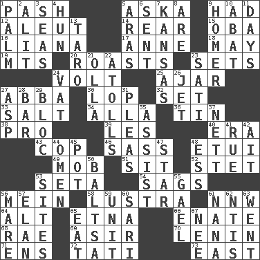 ACROSS 1. Romantic infatuation 5. "____ silly question..." 9. Possessed 12. Native American of Southwest Alaska 14. Posterior 15. Chief or king in Benin or Nigeria 16. Climbing, woody, usually tropical vines 17. Queen of England 1702-14 18. Can I? 19. Mountains (abbr.) 20. Exposes to great heat 23. Arranges properly for use 24. Electrical Unit 25. Partly open 27. Swedish rock group 30. Trim (branches) 32. Arrange properly for use 33. Table seasoning 34. Silent film actress Nazimova 36. Shallow baking pan 38. Adept person 39. French article 40. Period 43. Police officer (slang) 46. Backtalk 48. Needle case 49. Crowd into 51. Be seated 52. Proofreading order 53. Stalk of a moss capsule 54. Settles 56. Count _ (2 wds.) 58. A period of five years 61. Compass dir. 64. Keyboard modifier key 65. Inactive volcano in Sicily 66. Related on the mother's side 68. Actress Charlotte 69. SW Saudi Arabia district 70. Soviet premier 1918-24 71. Followers of ems 72. Jacques of French films 73. Compass direction DOWN 1. Inside of hand 2. Set down 3. Oceans 4. Attila the _ 5. Ancient river in northeast Turkey 6. Transmitted 7. Sunflower state 8. "We ___ not amused" (Victoria) 9. Homing pigeon 10. Blind as ____ 11. 24-hour periods 13. Edible starchy tuberous root 21. Water jar 22. Ringlike coral islands and reefs 23. Suttee (variant) 24. Large container 26. _ stream 27. Cleo's killer 28. Drinking establishment 29. Coalition 31. Entreaties 35. Aid 37. Remaining after all deductions 41. Regret 42. Small island 44. Presage 45. Plant holder 47. Play the lead 48. Double-curved letter 50. Greek mezzo-soprano Agnes 53. Settings 55. Highlander 56. Female horse 57. Flair 59. A single undivided whole 60. Indian skirt 61. Nanny 62. Nuclear Threat Initiatives 63. Gone 65. Ingest 67. Born