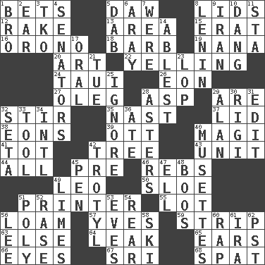 ACROSS 1. Antes 5. Fool 8. Hats (slang) 12. Immoral or dissolute person 13. Length times width 15. Part of Q.E.F. 16. U. of Maine site 18. Sharp remark 19. Nanny 20. Nonscientific branch of learning 22. Crying or shouting loudly 24. "Change" in Tahitian 26. Period of immesurable duration 27. Cassini of fashion 28. Cleo's killer 29. "We ___ not amused" (Victoria) 32. Use a spoon 35. Political cartoonist Thomas 37. Hat (slang) 38. Immeasurably long periods of time 39. Baseball player Mel 40. Wise men 41. Small child 42. Family _ (genealogy) 43. A single undivided whole 44. Everything 45. Before (prefix) 46. Confederate soldiers (slang) 49. Lion 50. A type of plum 51. Hard copy producer 55. Car dealer's back yard 56. Rich soil 57. Jacques Cousteau's middle name 59. Long narrow piece of something 63. Otherwise 64. Path through which fluid escapes 65. Hearing organs 66. Sight organs 67. _ Lanka 68. Petty quarrel DOWN 1. Sis' sibling 2. Ewer handle 3. Ring climax 4. Elected representatives 5. Small moist lump or mass 6. Like ___ of sunshine 7. We are 8. Soviet premier 1918-24 9. SW Asia republic 10. Mild oath, euphamism for damn 11. R.R. building 14. Most capable 17. Relating to the mouth 21. Third day of the wk. 23. Chop off 25. Disregard 28. Michaelmas daisies 29. ____ Jay Lerner 30. Swiss mountan, "Queen of the Mountains" 31. Prepare for publication 32. Stalk of a moss capsule 33. Implement 34. International (abbr.) 36. Had dinner 40. French bagpipes 42. TNT 45. Fenced enclosure 47. Pipe bend 48. Expressions of contempt or scorn 49. Citrus fruits 51. More than one (prefix) 52. Raze (variant) 53. Nights before holidays 54. Located in or toward the back 56. Area sheltered from the wind 58. What Jean-Claude Killy likes to do 60. Reproach for some lapse or misdeed 61. Lyricist Gershwin 62. Pacific Standard Time (abbr.)
