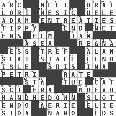 ACROSS 1. Curve 4. Confront 8. Naughty child 12. Australian parrot (variant) 14. Of or pertaining to a meson 16. Ubangi River tributary 17. First man 18. Pleas 20. Likely to tip or tilt 22. Conclude 23. Fish or hair follower 24. Followers of ems 25. Shade tree 28. Scottish cap 30. Toward the sea 31. Rain (Swedish) 35. Curvy letter 37. Not kosher 40. ____ Jay Lerner 41. Narrow board 42. Having lost freshness 44. Grant temporary use of 45. Capri or Wright 46. Indian titles of respect 47. _ tizzy (2 wds.) 48. _ dish (used to culture cells) 50. Pace 52. R.R. building 54. Third day of the wk. 55. Feline 58. _-fi 61. Epoch 63. New (sp.) 65. Sleeping bag shop? 70. Narrow, elongated depression 71. Inside; within (prefix) 72. Nest on high 73. Writer Wiesel 74. Portico 75. Billionth: prefix 76. Begley and Asner DOWN 1. Having winglike extensions 2. "The Thinker" sculptor 3. Dice game 4. Madame (abbr.) 5. Car or cant ending 6. Eastern Standard Time (abbr.) 7. Become fatigued 8. On the contrary 9. It's straight from the horse's mouth 10. Toward shelter 11. Trial 13. Naughty child 15. Penny 19. The sixth month of the Jewish calendar 21. Affirmative reply 26. Allows 27. Shops 29. Ear of corn 30. Michaelmas daisies 32. Small, secluded valley 33. Grandmother 34. Plus 35. Otherwise 36. Table seasoning 38. Hearing organ 39. Talk or behave amorously 41. Small drink 43. Son of Isaac 49. Detail 51. Nine, plus one 53. Length times width 55. Cell (Danish) 56. Shun 57. Lugs 58. "______ My Girl" (Turtles hit) 59. Patter 60. Southeast Asian peninsula 62. Arabian gulf 64. Purpose 66. ___ good deed 67. Mouth or opening 68. Victory 69. Modern: prefix