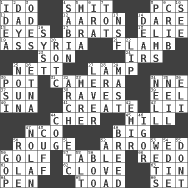 ACROSS 1. Wedding promise 4. Stricken, poetically 8. Personal Computers (abbr.) 11. Male parent 12. Composer Copland 14. Have the gumption 15. Snake ____ (dice throw) 17. Naughty children 18. Writer Wiesel 19. Nineveh was its capital 21. Flambe (short form) 23. Male offspring 24. Big collection agency 25. Remaining after all deductions 27. Desk light 30. Plant holder 31. Device for capturing images 34. Compass dir. 37. Player for Phoenix 38. All-night dance parties 39. Snakelike fish 40. _ tizzy (2 wds.) 41. Make 43. Cards in a Roman deck? 44. "Mermaids" star 45. Place where flour is made 47. Non-commissioned officer (abbr.) 49. Of large size 50. Makeup applied to the cheeks 52. Moved like an arrow 56. Eighteen holes 57. Eating place 60. Do over again 61. Norwegian king 62. Garlic unit 63. Shallow baking pan 64. Animal enclosure 65. Frog relative 66. Put into a specified state DOWN 1. It may be bright or harebrained 2. 24-hour periods 3. Lyric poems 4. Unit of acoustic absorption 5. Hindu Mythology: god of death 6. Lyricist Gershwin 7. Small child 8. Insides of hands 9. Baby bed with high sides 10. Observe 13. Overdraft (abbr.) 14. Letter starter 16. System (abbr.) 20. College mil. group 22. Mouth edge 25. Part of speech 26. Inactive volcano in Sicily 27. Prying instrument 28. Length times width 29. Vertical spar for supporting sails 30. 23rd letter of the Greek alphabet 32. Bowlike part 33. Female horse 34. 1994 drama film starring Jodie Foster 35. Famous astronaut Armstrong 36. Biblical high priest 42. Arab leader 44. Gear tooth 46. Russian composer Stravinsky 47. Pitcher Ryan 48. _ links 49. A special lineage 50. Hero or heavy, e.g. 51. And so on (abbr.) 52. Inventor's middle name 53. Soaks 54. Singer Brickell 55. Do not 56. Republican Party 58. The first octave above the treble staff 59. Surprise greeting