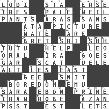 ACROSS 1. Farming town in central California 5. R.R. building 8. Celtic language 12. Angers 13. Diluted with white 15. Famous astronaut Armstrong 16. Leg coverings 18. Ancient river in northeast Turkey 19. Without 20. _ moment's notice (2 wds.) 22. Photo 24. Nathan's nickname 26. "We ___ not amused" (Victoria) 27. Cy Young winner Saberhagen 28. Indian title of respect (Mr.) 29. Quiet! 32. Ballerina skirt 35. Aid 37. Lion 38. Taken by mouth 39. Retirement account (abbr.) 40. Leaves 41. Slender fish 42. Scram! 43. Ubangi River tributary 44. The first octave above the treble staff 45. French article 46. 90 degrees 49. Unit of force equal to gravity 50. In a ____ (agitated or irritated) 51. Mood resulting from idleness 55. Australian flightless bird 56. "Two Mules for Sister ____" 57. Inky black, to poets 59. First class 63. SW Asia republic 64. Loose flowing garment 65. Muslim summons to prayer 66. Inconspicuous attention getter 67. Eastern Standard Time (abbr.) 68. Allows DOWN 1. Mouth edge 2. Mouth or opening 3. Lair 4. Byzantium, centuries later 5. Health resort 6. Canvas cover 7. Jai ____ 8. Take place subsequently 9. Tail end 10. Trig term 11. Raised railways 14. Fortification 17. Play the lead 21. Had dinner 23. Three (prefix) 25. Principles of right and wrong 28. Chalkboards 29. A type of plum 30. Person who is morally reprehensible 31. Flexible conduit 32. Ancient Roman robe 33. Mountain range 34. Small pie 36. Epoch 40. From the throat 42. Sowing specialist 45. Area sheltered from the wind 47. One (Scot) 48. Simple or foolish person 49. Monetary aid 51. Oblong pieces of solid material 52. Mouths or openings 53. Mitch Miller's instrument 54. Crowds into 56. Small drink 58. Fish or hair follower 60. Ending with capital 61. Floor protector 62. Followers of ems