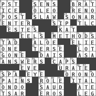 ACROSS 1. Pacific Standard Time (abbr.) 4. Elected reps. 8. Naughty child 12. Frozen water 13. Margarine 14. Former U.S. Attorney General Janet 15. Mail 17. Cole _ (cabbage dish) 18. Echolocation 19. Keyboard key 21. Small drink 23. Affectionate concern, for short 24. _____ Park, CO 26. Krazy ___ of comics 28. Snakelike fish 30. Modes 34. Small boy 37. Medicinal plant 39. Writer Wiesel 40. Single 41. Laconic 43. Car dealer's back yard 44. Went 46. Raised platform 47. White ___ sheet 48. Replies 51. Smile enhancers 54. First lady 55. A salt of uric acid 58. Health resort 61. Sight organ 63. U. of Maine site 65. Aches 67. Hero or heavy, e.g. 71. Slanted text style (abbr.) 72. Southwest Nigerian state 73. Saudi Arabian king (1953-1964) 74. Had dinner 75. Russian ruler of old 76. Greek god of love 77. Part of a journey DOWN 1. Corncob 2. Biscuitlike quick bread 3. Trials 4. Mayday 5. Pipe bend 6. Teachers' org. 7. Sty mamas 8. Sis' sibling 9. Monthly bill 10. Of or related to the anus 11. Torque (variant) 16. Wig 18. Petty quarrel 20. Portuguese money of account (variant) 22. Mamie's mate 25. Narrow board 27. Definite Article 29. Bobsleighs 30. Mesonic 31. Water jar 32. "Vaya con ____" 33. Stalk of a moss capsule 34. Ancient Roman robe 35. At once, immediately (arch.) 36. Hiding places for outlaws 38. Mouth or opening 42. He sold his birthright 45. She-sheep 49. Nights before holidays 50. Marina Del _, California 52. Adept person 53. Indian skirt 56. Add up to 57. Related on the mother's side 58. Specific locale 59. Zero-star reviews 60. Opera by Verdi 62. Celtic language 64. Cassini of fashion 66. Or not 68. Rowing implement 69. Nilotic language 70. Begley and Asner