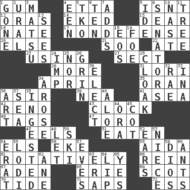 ACROSS 1. Chewing product 4. Singer James 8. Is not 12. Mouths or openings 14. Made supply last 15. Letter starter 16. Nathan's nickname 17. Unrelated to defense, as in spending 20. Otherwise 21. "Barney Miller" actor Jack 22. Had dinner 23. Exploiting 27. Religious group 29. Greater amount 31. Australian parrot (variant) 34. Showery time 35. Northwest Algerian city 36. SW Saudi Arabia district 39. Teachers' org. 41. At sea 42. Former U.S. Attorney General Janet 43. Timepiece 46. Labels 47. "Corrida" creature 48. Snakelike fish 51. Eroded 54. Raised railways 56. Make supply last 58. Opera by Verdi 61. Producing rotation 66. It's straight from the horse's mouth 67. Arabian gulf 68. One of the Great Lakes 69. Native of Scotland 70. Periodic rise and fall of the sea level 71. Plant excrements 72. Curvy letter DOWN 1. Went 2. Mountain range 3. Taiwanese island in East China Sea 4. Car or cant ending 5. Ring climax 6. "___ Little Indians" 7. Sums up 8. Binary compound 9. Legislators 10. Political cartoonist Thomas 11. Family _ (genealogy) 13. Perceives with the eye 18. Greek goddess of the dawn 19. Enemy 24. Mischievous child 25. And not 26. Smile widely 28. Hide under a false appearance 30. Voters do this 32. Actress Charlotte 33. _ tizzy (2 wds.) 34. Came up 36. Tate display 37. Ocean 38. Eaten 40. Medicinal plant 44. Mouth or opening 45. Small bed 49. Allow 50. What Jean-Claude Killy likes to do 52. Hearing organs 53. Sibling's daughter 54. Part of Q.E.F. 55. Farming town in central California 57. Nights before holidays 59. "Vaya con ____" 60. Pismires 62. A saturated hydrocarbon 63. Period 64. Mouth edge 65. Consenting reply