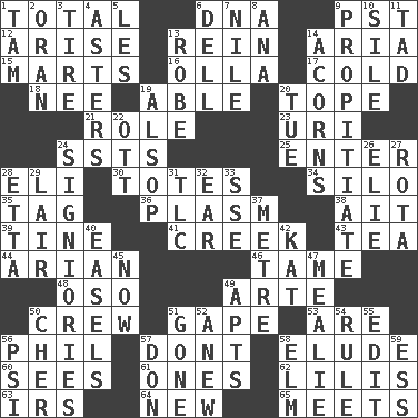 ACROSS 1. Add up to 6. Heredity factor (abbr.) 9. Pacific Standard Time (abbr.) 12. Originate 13. It's straight from the horse's mouth 14. Roberta Peters solo 15. Shops 16. Spanish pot 17. Having a low temperature 18. Born 19. Competent 20. Drink excessively 21. Hero or heavy, e.g. 23. RI univ. 24. Fast planes 25. Keyboard key 28. Biblical high priest 30. Hauls 34. Grain storage tower 35. Label 36. Suffix with ecto or cyto 38. Small island 39. Prong on a fork 41. Small stream 43. Afternoon social gathering 44. Believer in; advocate of (suffix) 46. Docile 48. Bear (Spanish) 49. Johnson of "Laugh-In" 50. Group working together 51. Open wide 53. "We ___ not amused" (Victoria) 56. Silvers or Donahue 57. Do not 58. Evade 60. Perceives with the eye 61. Singles 62. Ms. Damita and namesakes 63. Big collection agency 64. ___ Haven, CT 65. Confronts DOWN 1. Scottish cap 2. Northwest Algerian city 3. Hoop that covers a wheel 4. Michaelmas daisies 5. French article 6. Small valley 7. "Death on the ____" 8. Santa ___, CA 9. Appease 10. Filth; sediment 11. Bit 13. Loose flowing garment 14. Oak nuts 19. Columnist Joseph or Stewart 20. Third day of the wk. 22. Baseball player Mel 24. Seigniories (variant) 26. Writer Wiesel 27. Roll call or roster of names 28. Singer James 29. Den 31. Affectionate concern, for short 32. Ewer handle 33. Compass dir. 37. Distance measurement (Brit.) 40. Artist's stands 42. Krazy ___ of comics 45. Immediately 47. Ear of corn 49. Tenement units (abbr.) 50. "Mermaids" star 51. Went 52. Afresh 54. General guideline 55. Prepare for publication 56. Air pressure measure (abbr.) 57. Spanish title 58. Shade tree 59. Double-curved letter