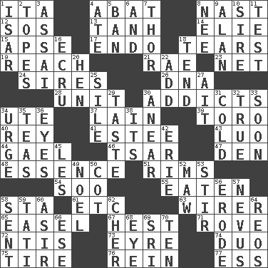 ACROSS 1. Call ___ day 4. Blind as ____ 8. Political cartoonist Thomas 12. Distress signal 13. Hyperbolic tangent 14. Writer Wiesel 15. Domed church section 17. Inside; within (prefix) 18. Rends 19. Arrive at 21. Actress Charlotte 23. Fish or hair follower 24. Founders of families 26. Heredity factor (abbr.) 28. A single undivided whole 30. Inveterate users 34. Shoshoni 37. (Had) reclined 39. "Corrida" creature 40. Marina Del _, California 41. First name in cosmetics 43. Nilotic language 44. Highlander 46. Russian ruler of old 47. Lair 48. Gist 51. Basketball hoops 54. "Barney Miller" actor Jack 55. Ingested 58. R.R. building 61. And so on (abbr.) 63. One who wires 65. Artist's stand 67. Behest 71. Be footloose 72. Nuclear Threat Initiatives 73. Jane of fiction 74. Superhero pair 75. Become fatigued 76. It's straight from the horse's mouth 77. Double-curved letter DOWN 1. Austrian river, tributary to the Danube 2. Drinks excessively 3. Slender Brazilian palm 4. Had dinner 5. Prohibit 6. Added to 7. Son of Odin 8. Born 9. Actor Alda or Thicke 10. Father 11. Trial 16. Shade of tan 18. Be inclined (to) 20. Layer 22. Find the sum of 25. Drop; flow; fall 27. Small island 29. Clothes sense 30. Approach 31. Lacking warmth 32. Loyal 33. Within a short period 34. Goad 35. Afternoon social gatherings 36. Sight organs 38. It is 42. One of the Great Lakes 45. French article 49. Christmas carol 50. Small bed 52. Informal term for the mouth 53. Use a swizzle stick 56. Wear away 57. Congenital growth or mark on the skin 58. Posted 59. Jacques of French films 60. SW Saudi Arabia district 62. "Mermaids" star 64. Vintage cars 66. Compass dir. 68. Sight organ 69. _ Lanka 70. Nine, plus one