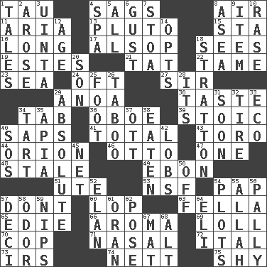 ACROSS 1. The 19th letter of the Greek alphabet 4. Droops 8. Atmosphere 11. Operatic vocal solo 13. Greek god of the underworld 15. R.R. building 16. Protracted 17. Columnist Joseph or Stewart 18. Perceives with the eye 19. _____ Park, CO 21. Make lace 22. Docile 23. Ocean 24. Often (poetically) 27. Title for a knight 29. Small Philippine buffalo 30. Clothes sense 34. Keyboard key 36. Mitch Miller's instrument 39. Unemotional 40. Plant excrements 41. "_____ Recall" 43. "Corrida" creature 44. Constellation of myth 46. "Beetle Bailey" pooch 47. Single 48. Having lost freshness 49. Inky black, to poets 51. Shoshoni 53. Overdraft (abbr.) 54. Infant food 57. Do not 60. Chop off 63. Chap (slang) 65. Singer Brickell 66. Odor 69. Hang loosely or laxly 70. Police officer (slang) 71. Rhinal 72. Slanted text style (abbr.) 73. Big collection agency 74. Remaining after all deductions 75. Like a shrinking violet DOWN 1. Falsehoods 2. Came up 3. National forest in Provo, Utah 4. Health resort 5. Everything 6. Abrupt rush of wind 7. Portico 8. At sea 9. A whole individual unit 10. Raze (variant) 12. Mature 14. Chooses 18. Ski resort town in Vermont 20. Manchild 25. Pick up the tab 26. Off limits 28. ___ a Wonderful Life 29. Utter; complete 31. Within a short period 32. Become fatigued 33. Environmental prefix 34. Small pie 35. Capital of Western Samoa 37. Baseball player Mel 38. Eroded 40. Distress signal 42. Tennis shots 45. Fish or hair follower 50. Below a satisfactory level 52. Liveliness 54. Secret plans 55. Assad's deity 56. Chummy 57. Tenth: prefix 58. Scent 59. Cuts off 61. NW Algerian seaport 62. Introduce or present, as a question 64. Connecticut Ivy Leaguer 67. Floor covering 68. Keyboard modifier key