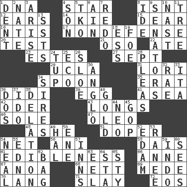 ACROSS 1. Heredity factor (abbr.) 4. Play the lead 8. Is not 12. Hearing organs 14. Migrant worker of the '30s 15. Letter starter 16. Nuclear Threat Initiatives 17. Unrelated to defense, as in spending 20. Trial 21. Bear (Spanish) 22. Had dinner 23. _____ Park, CO 27. Back-to-school mo. 29. Southern CA. univ. 31. Australian parrot (variant) 34. Soup utensil 35. Part of Q.E.F. 36. "You Light Up My Life" star Conn 39. Oval reproductive body of a fowl 41. Toward the sea 42. Baltic tributary 43. Yearns 46. Flatfish 47. Margarine 48. American tennis player Robert 51. Drug addict 54. Fish or hair follower 56. Cuckoo 58. Raised platform 61. The property of being fit to eat 66. Queen of England 1702-14 67. Small Philippine buffalo 68. Remaining after all deductions 69. Ancient Persian 70. Austrian-born American filmmaker Fritz 71. Kill 72. Greek goddess of the dawn DOWN 1. Scratch 2. Nathan's nickname 3. Ascend 4. Male child 5. Ring climax 6. The 18th letter of the Arabic alphabet 7. Redecorate 8. Binary compound 9. Elected representatives 10. Political cartoonist Thomas 11. Family _ (genealogy) 13. Fast planes 18. Double-curved letter 19. Enemy 24. Uncastrated adult male sheep 25. Environmental prefix 26. A type of plum 28. Entreaties 30. White American of non-Hispanic descent 32. Actress Charlotte 33. Call ___ day 34. Begets 36. Two (Sp.) 37. Wedding promise 38. Conveyance 40. Gilt 44. Modern: prefix 45. Grand Old Party 49. Actor Linden 50. Compass dir. 52. Dutch treat 53. The wife of a rajah (variant) 54. Be tempered by heat 55. Pulitzer Prize-winning author Ferber 57. Lodging establishments 59. _ china 60. Observes 62. Paper or plastic container 63. Snakelike fish 64. R.R. building 65. Filthy place