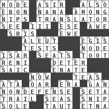 ACROSS 1. Method 5. SW Saudi Arabia district 9. In addition 13. Inky black, to poets 14. Nanny 15. Amid 16. Pinches, bites 17. Interpreter 19. Perceive with the eye 20. One more than two 21. Compass dir. 22. Deep reverence 23. Indian titles of respect 25. She-sheep 26. Eskimo relative 30. The front part of a cuirass 34. Trials 35. Connecting point 36. Austrian river, tributary to the Danube 39. Theater features 42. A blast of a horn 43. Painter Guido (1575-1642) 44. Prevent from occurring 46. Ketch in the Levant 47. Related on the mother's side 48. At this time 51. Afternoon social gatherings 54. _ moment's notice (2 wds.) 57. Boat paddle 58. Epoch 60. Separate the seeds from cotton 62. Unrelated to defense, as in spending 65. Bristle 66. Get behind 67. Oceans 68. Sever or remove by pinching or nipping 69. Flatfish 70. Tense 71. Inactive volcano in Sicily DOWN 1. Not women's 2. Off-Broadway awards 3. Drug addict 4. Followers of ems 5. Against 6. Indian skirt 7. _ tizzy (2 wds.) 8. The wife of a rajah (variant) 9. Wet nurse (var.) 10. Globular water bottle used in Asia 11. Frozen precipitation 12. Legendary monster 15. Toward shelter 18. Compass dir. 20. Small island 24. Of or pertaining to medicine 27. Curvy letter 28. Shoshoni 29. Sadhe (variant) 30. Main course 31. Thick or sticky substance 32. Wedding promise 33. Put into a specified state 36. Big collection agency 37. Ocean 38. Cuckoo 40. "___ Little Indians" 41. R.R. building 45. Singer James 48. Christmas carol 49. Clumsy lout 50. Take or capture by force 52. Representative 53. Smooth fabric 54. Pismires 55. "Corrida" creature 56. Of or related to the anus 58. He sold his birthright 59. Relief 61. California wine valley 63. Expire 64. Teachers' org. 65. Compass dir.