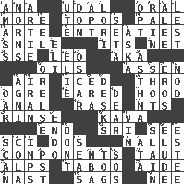 ACROSS 1. Santa ___, CA 4. Hereditary estate 8. Spoken 12. Greater amount 14. Literary convention 16. Diluted with white 17. Johnson of "Laugh-In" 18. Pleas 20. Grin 22. It is 23. Fish or hair follower 24. Compass dir. 25. Lion 28. Alias (abbr.) 30. Petroleums 31. NE Netherlands city 35. Atmosphere 37. On the rocks 40. Through, poetically 41. Legendary monster 42. Having ears or earlike features 44. Parka part 45. Of or related to the anus 46. Raze (variant) 47. Mountains (abbr.) 48. Remove soap 50. Polynesian shrub of the pepper family 52. Conclusion 54. Indian title of respect (Mr.) 55. Perceive with the eye 58. _-fi 61. Two (Sp.) 63. Shopping centers 65. Pieces 70. Pulled tight 71. High mountains 72. Off limits 73. Helper 74. Political cartoonist Thomas 75. Settles 76. Born DOWN 1. Collect or gather 2. Typical standards 3. Nick name for Arthur 4. Shoshoni 5. Spanish title 6. Fitting 7. Australian parrot (variant) 8. Choose 9. Water falling in drops from the sky 10. Toward shelter 11. For fear that 13. Snakelike fish 15. Bristle 19. "____ silly question..." 21. Biblical high priest 26. Writer Wiesel 27. Motion picture award 29. Respiratory problem 30. Threatening words 32. Guess 33. Greek god of love 34. Dreamland 35. Hindu god of fire 36. SW Asia republic 38. Period 39. Writing tables 41. Boat paddle 43. Letter starter 49. Inside; within (prefix) 51. Zeal 53. Do not 55. Killed 56. Evade 57. First name in cosmetics 58. Examine minutely or intensely 59. Root beer relative 60. Naughty children 62. Oceans 64. "One Day ___ Time" 66. Pacific Standard Time (abbr.) 67. Basketball assoc. 68. Coat; cloak 69. Distress signal