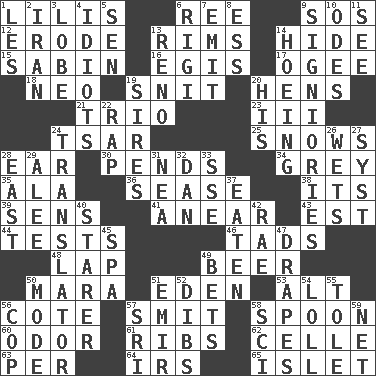 ACROSS 1. Ms. Damita and namesakes 6. To sift 9. Distress signal 12. Wear away 13. Basketball hoops 14. Flintstone garb 15. Unit of acoustic absorption 16. Armor plate that protects the chest 17. Double curve, resembling the letter S 18. Modern: prefix 19. In a ____ (agitated or irritated) 20. Coop moms 21. Musical group of three 23. One more than two 24. Russian ruler of old 25. Overwhelms 28. Ewer handle 30. Hangs 34. Jennifer or Joel 35. Chicken ___ king 36. Gospel singer Marvin 38. ___ a Wonderful Life 39. Elected reps. 41. Approach 43. Eastern Standard Time (abbr.) 44. Trials 46. Small boys 48. Infant locale 49. Fermented drink made from hops 50. Hindu Mythology: god of death 51. Genesis locale 53. Keyboard modifier key 56. ____ d'Azur (French Riviera) 57. Stricken, poetically 58. Soup utensil 60. Aroma 61. Chest bones 62. Cell (Danish) 63. For each 64. Big collection agency 65. Small island DOWN 1. French article 2. SW Asia republic 3. Ear part 4. Foolish or stupid persons 5. Elected rep. 6. Swiss mountan, "Queen of the Mountains" 7. Give off 8. Curvy letter 9. Seigniories (variant) 10. Lyric poems 11. Observe 13. Western Nevada city 14. Weeding 19. Titles for men of rank and authority 20. Part of HMS, perhaps 22. Hit sharply and swiftly 24. Interpreter 26. Soaks 27. System (abbr.) 28. 90 degrees 29. Toward shelter 31. Teachers' org. 32. Daniel's nick name 33. Compass dir. 37. Ingested 40. A viewer who gazes fixedly 42. Actress Charlotte 45. Health resort 47. Window treatments 49. Antes 50. Method 51. Independent ruler or chieftain 52. Claim 54. Hang loosely or laxly 55. Lacquered or enameled metalware 56. Police officer (slang) 57. Indian title of respect (Mr.) 58. _-fi 59. Fish or hair follower