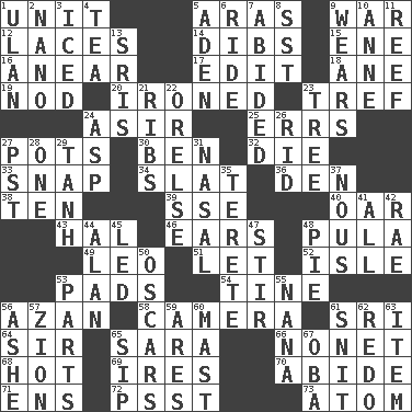 ACROSS 1. A single undivided whole 5. Ancient river in northeast Turkey 9. Armed conflict 12. Shoestrings 14. Claim 15. Compass dir. 16. Approach 17. Prepare for publication 18. One (Scot) 19. Lower and raise head in agreement 20. Pressed 23. Not kosher 24. SW Saudi Arabia district 25. Blunders 27. Cooking vessels 30. Benjamin's nick name 32. Expire 33. Fastener 34. Narrow board 36. Lair 38. Nine, plus one 39. Compass dir. 40. Rowing implement 43. Actor Linden 46. Hearing organs 48. Monetary unit of Botswana 49. Lion 51. Allow 52. Capri or Wright 53. Writing tablets 54. Prong on a fork 56. Muslim summons to prayer 58. Device for capturing images 61. _ Lanka 64. Title for a knight 65. "Two Mules for Sister ____" 66. Music written for nine 68. Being at a high temperature 69. Angers 70. Remain 71. Followers of ems 72. Inconspicuous attention getter 73. Smallest unit of an element DOWN 1. ____ Bator, Mongolia 2. Billionth: prefix 3. On the rocks 4. Afternoon social gathering 5. An important port of Yemen 6. Travel on an animal 7. Stayed 8. Fast jet (abbr.) 9. Erodes 10. Singer Murray 11. Coral ridge 13. Indian titles of respect 21. Teases 22. Threatening words 23. Family _ (genealogy) 24. Cleo's killer 26. To free from 27. Pacific Standard Time (abbr.) 28. Single 29. Hyperbolic tangent 31. Rhinal 35. Cylindrical with tapered ends 37. Good sense 41. 100% 42. Actress Charlotte 44. ____ Jay Lerner 45. Directed 47. Use a swizzle stick 48. Sliced dessert 50. Motion picture awards 53. Components 55. Nanny 56. American tennis player Robert 57. The Jewish people; Israel 59. Ancient Greek god of war 60. Vertical spar for supporting sails 61. In a ____ (agitated or irritated) 62. Do over again 63. Detail 65. Small drink 67. Chief or king in Benin or Nigeria