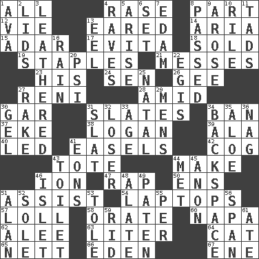ACROSS 1. Everything 4. Raze (variant) 8. Role in a play 12. Compete 13. Having ears or earlike features 14. Operatic vocal solo 15. The sixth month of the Jewish calendar 17. Webber/Rice musical 18. Exchanged or delivered for money 19. Paper fasteners 21. Makes clutter 23. Part of HMS, perhaps 24. Elected rep. 26. Unit of force equal to gravity 27. Painter Guido (1575-1642) 28. Among 30. Slender fish 31. Chalkboards 34. Forbid 37. Supplement with great effort 38. Utah city north of Ogden 39. Chicken ___ king 40. Directed 41. Artist's stands 42. Gear tooth 43. Carryall 44. Cause to be 46. Electrically charged atom 47. Reproach for some lapse or misdeed 50. Followers of ems 51. Help 54. Portable computers 57. Hang loosely or laxly 58. Declaim 60. California wine valley 62. Toward shelter 63. 61 cubic inches 64. Feline 65. Remaining after all deductions 66. Locale of original sin 67. Compass dir. DOWN 1. Actress Gardner 2. Flaplike coverings 3. Resembling or made to resemble leather 4. All-night dance parties 5. Originate 6. Put into a specified state 7. Dutch treat 8. Went by 9. Came up 10. Cause heat under the collar 11. Bits 13. Snakelike fish 16. Precipitation 20. 23rd letter of the Greek alphabet 22. The front part of a cuirass 25. Brizilian seaport 27. Libertine 29. Not women's 30. Set 31. Narrow board 32. Failure 33. Personal question 34. Keyboard key 35. _ vera 36. Tired old horse 41. Immeasurably long periods of time 43. Bathroom 44. Was introduced to 45. At once, immediately (arch.) 46. Small island 48. Having winglike extensions 49. Eucharist need 51. Actor Alda or Thicke 52. Flatfish 53. Lacquered or enameled metalware 55. For each 56. Connect, as a bridge 59. To free from 61. Had dinner