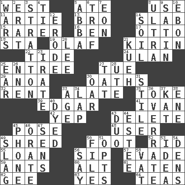 ACROSS 1. 270 degrees 5. Had dinner 8. Purpose 11. Nick name for Arthur 13. Sis' sibling 14. Broad, flat, thick piece 15. More uncommon 16. Benjamin's nick name 17. "Beetle Bailey" pooch 18. R.R. building 19. Norwegian king 21. Japanese brewing company 22. Periodic rise and fall of the sea level 24. Uhlan (variant) 25. Main course 27. Third day of the wk. 29. Small Philippine buffalo 30. Curses 32. Monthly bill 33. Having winglike extensions 35. Puff or smoke 39. _ Allan Poe 41. "Terrible" tsar 42. Slangy assent 43. Keyboard key 45. Airs 48. One who makes use of a thing 49. Fragment 50. One third of a yard 52. To free from 55. Grant temporary use of 56. Small drink 57. Dodge 59. Pismires 60. The first octave above the treble staff 61. Consumed 62. Turn to the right 63. Affirmative reply 64. Afternoon social gatherings DOWN 1. Armed conflicts 2. Part of Q.E.F. 3. Ski resort town in Vermont 4. Standoff 5. Swedish rock group 6. Unclean, religiously 7. A really long time 8. Extreme 9. Smooth fabric 10. Inky black, to poets 12. Eat (away) 14. Earth 20. Area sheltered from the wind 21. Malaysian steamed pastry 23. Feeling or showing extreme anger 25. Hearing organ 26. Compass dir. 27. Make lace 28. Shoshoni 30. Boat paddle 31. Vertical member of a panel or frame 33. Grow older 34. Pet locale 36. Make much ado about nothing 37. Krazy ___ of comics 38. Compass dir. 40. Colored 43. Superhero pair 44. First name in cosmetics 45. Give a jingle 46. Declaim 47. Elected reps. 49. Volcanic refuse 50. Do some clerical work 51. Elects 53. It may be bright or harebrained 54. Hiding places for outlaws 56. Declare 58. Large container
