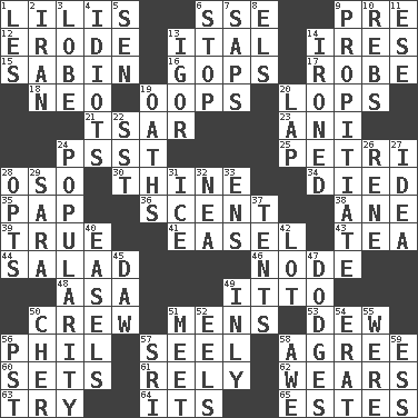 ACROSS 1. Ms. Damita and namesakes 6. Compass dir. 9. Before (prefix) 12. Wear away 13. Slanted text style (abbr.) 14. Angers 15. Unit of acoustic absorption 16. Republicans 17. Loose flowing garment 18. Modern: prefix 19. I made a mistake 20. Chops off 21. Russian ruler of old 23. Cuckoo 24. Inconspicuous attention getter 25. _ dish (used to culture cells) 28. Bear (Spanish) 30. One or ones belonging to thee 34. Passed on 35. Infant food 36. Odor 38. A saturated hydrocarbon 39. Loyal 41. Artist's stand 43. Afternoon social gathering 44. Vegetable dish 46. Thickened enlargement 48. White ___ sheet 49. "Tell ____ the Marines!" 50. Group working together 51. Not women's 53. Morning condensation 56. Silvers or Donahue 57. Sew up the eyelids of hawks and falcons 58. Match 60. Puts into a specified state 61. Have trust in 62. Erodes 63. Attempt to accomplish something 64. It is 65. _____ Park, CO DOWN 1. French article 2. SW Asia republic 3. Ear part 4. Foolish or stupid persons 5. Elected rep. 6. Close up, plug up 7. Plant excrements 8. Raised railways 9. Appease 10. Confederate soldiers (slang) 11. Compass dir. 13. Composer Stravinsky 14. Pressed 19. Curses 20. Infant locale 22. Fast jet (abbr.) 24. Teen's desire 26. French philosopher Descartes 27. The content of cognition 28. Chooses 29. "Two Mules for Sister ____" 31. Frozen water 32. Teachers' org. 33. Followers of ems 37. Portable shelters 40. Artist's stands 42. Car dealer's back yard 45. Obsolete 47. Evades 49. In an inward manner 50. "Mermaids" star 51. Rendezvous 52. Snakelike fish 54. Part of Q.E.F. 55. We are 56. Pacific Standard Time (abbr.) 57. Indian title of respect (Mr.) 58. Deep reverence 59. Curvy letter
