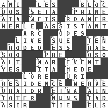 ACROSS 1. Cuckoo 4. French article 7. Coalition 11. Two (Sp.) 12. Stalk of a moss capsule 13. First class 14. "One Day ___ Time" 15. Soaks 16. Wanderer 17. Haggard of country music 19. Aide 21. Curve 23. Lyric poems 24. Not recorded 25. Take to court 26. "___ Little Indians" 29. Cowboy competition 30. Curvy letter 31. Actress Charlotte 32. "Barney Miller" actor Jack 33. Before (prefix) 34. Bear (Spanish) 35. Keyboard modifier key 36. Armed conflict 37. Happening 40. Affirmative reply 41. Call ___ day 42. Ancient Persian 43. Old wives' tales, e.g. 45. RI univ. 46. Home 51. Boldness 55. Speaker 56. Inactive volcano in Sicily 58. The 18th letter of the Arabic alphabet 59. Carrier 60. Religious women 61. Small amount or degree 62. SW Saudi Arabia district 63. Neckwear 64. Raised railways DOWN 1. First of billions? 2. Short letter 3. Austrian river, tributary to the Danube 4. Area sheltered from the wind 5. Singer James 6. Backtalk 7. Naughty children 8. Pale green bean 9. Presage 10. Certainty 12. Turn aside suddenly 13. Airs 16. Amusement-park features 18. Put down 20. Lush 22. Corporate head (abbr.) 24. Plunders 25. Father Junipero _ 26. Marketplace scale 27. 90 degrees 28. Modern: prefix 29. Hero or heavy, e.g. 32. Declare 33. Eucharist need 36. One who wires 37. Australian flightless bird 38. Actresses Bloom and Felton 39. Singer Brickell 43. 61 cubic inches 44. Aroma 46. Roll call or roster of names 47. Greek god of love 48. Suttee (variant) 49. Penny 50. Needle case 52. Assign a rank or rating to 53. Small bottle 54. Conclusions 57. Compass dir.